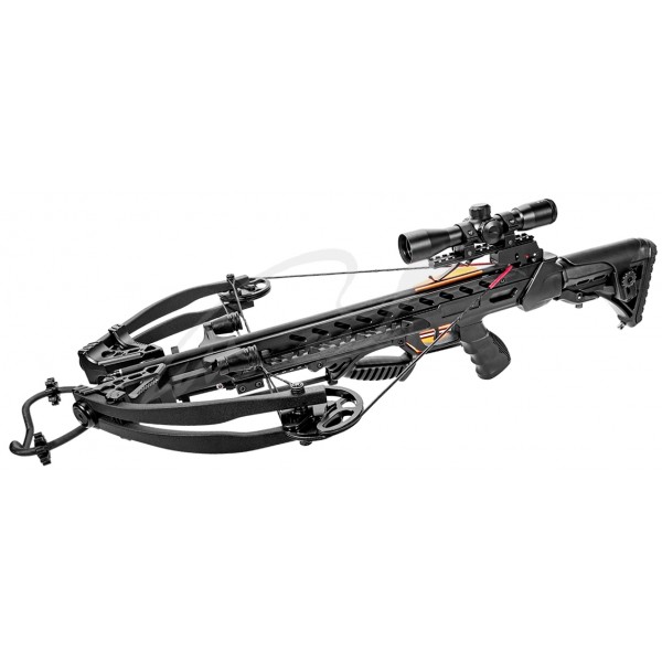 Блочный тип подразумевает наличие системы тросов и эксцентриков, которые призваны уменьшить износ устройства и провести выстрел «чище», ведь, как известно, именно блочная конструкция придает правильный разгон стреле в момент вылета. Арбалет выполнен в компоновке булл-пап, что позволило увеличить направляющую без увеличения габаритов устройства. Удлиненная направляющая позволяет использовать более длинные стрелы (до 20”), что будет актуально при использовании наконечников типа «broadhead». Вдобавок, арбалет оснащен прицельной планкой Weaver, предназначенной для установки прицельных приспособлений, которые призваны увеличить точность стрельбы.