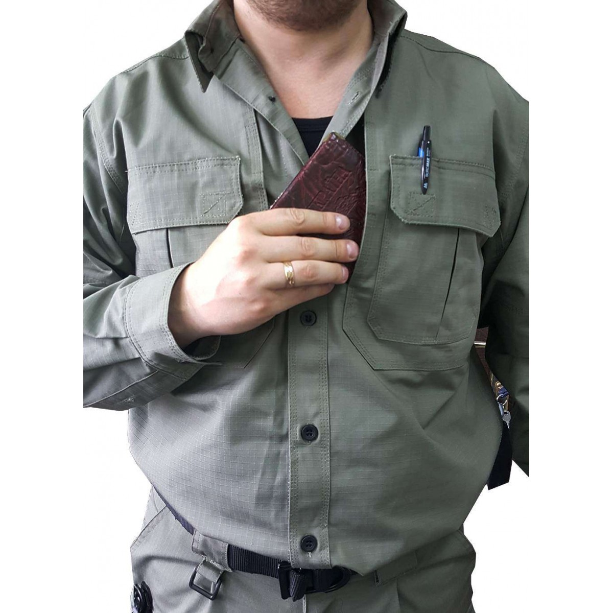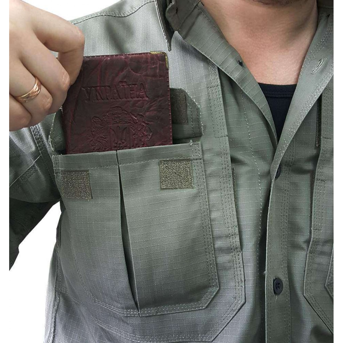 - Карманы на груди пошиты по инновационной технологии под обычным карманом кроется потайной гораздо большей площадью. В такое отделение легко положить снаряжение типа блокнота, тетради или других крупных предметов.