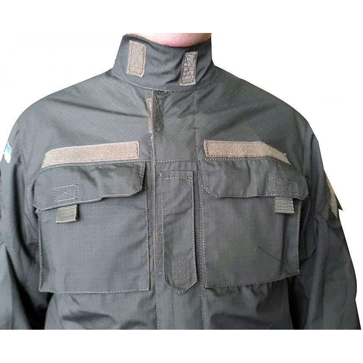 - Воротник кителя пошит в виде стойки. Такая форма горловины предохраняет шею от травмирования бронежилетом.