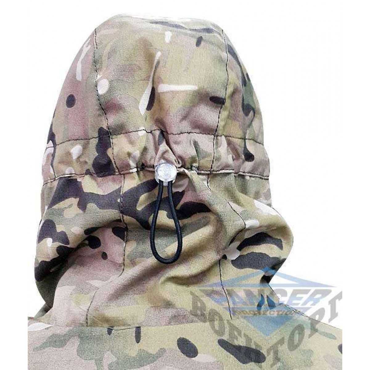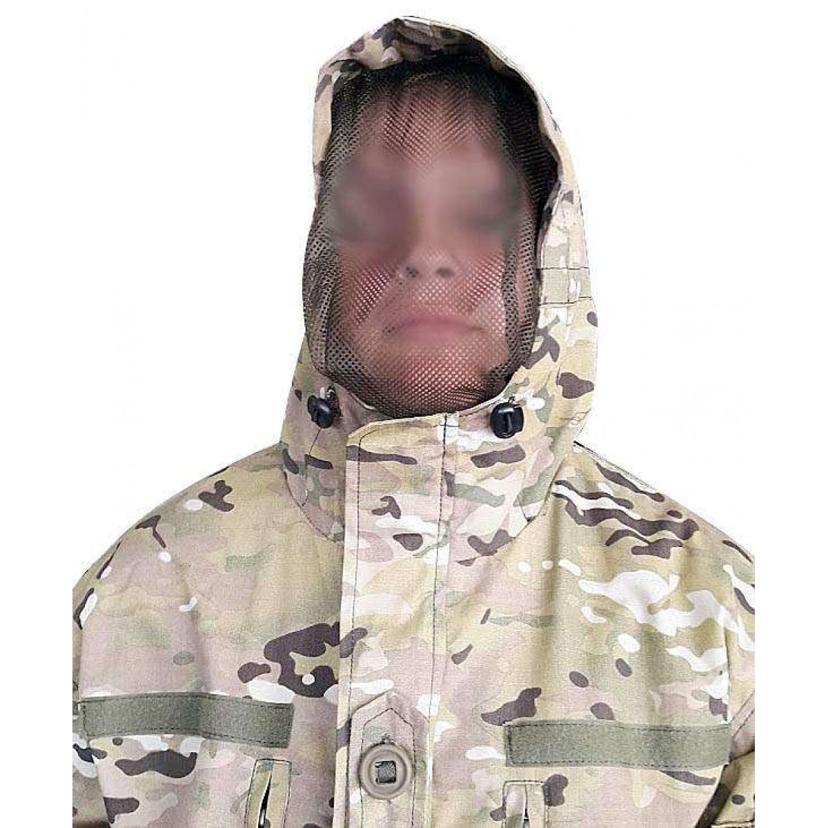 Удобный плотный капюшон переходит в стойку-воротник. Предусмотрены сетка для защиты от разнообразных насекомых и шнурки, затянув которыми воротник по объему шеи можно предотвратить попадание грязи и пыли под одежду.