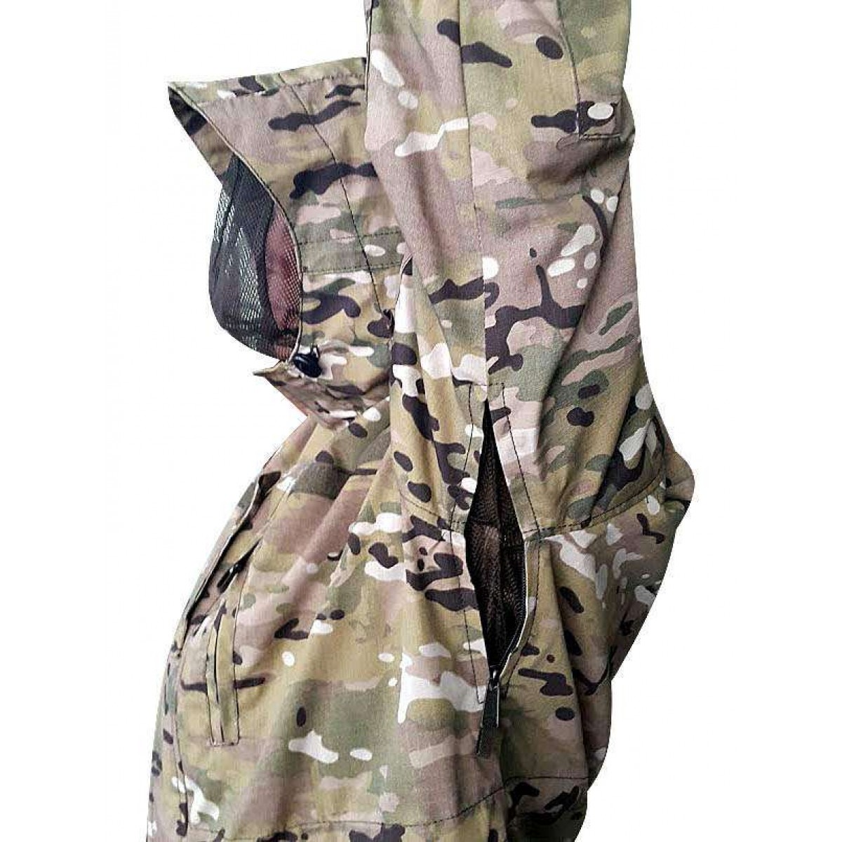 На всем костюме 17 карманов. В капюшон встроена сетка, которая надевается на лицо, защищает вас от насекомых, так же под мышками установлена молния для проветривания. карманы для демпферных вставок на локтях и на коленях,
