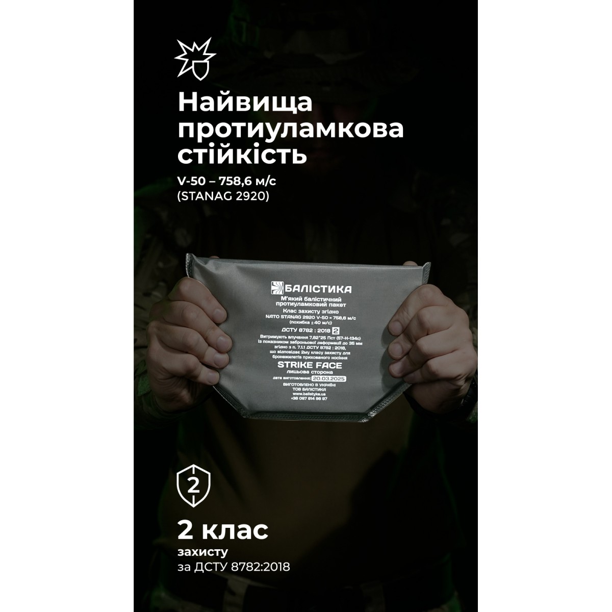 Бронепакет от «Баллистика» делает сумку-напашник производства WAS еще более функциональной и защищает пахово-абдоминальну зону. ✅ Ключевые преимущества Самые высокие показатели противоосколочной стойкости: бронепакет из 50 слоев СВМПЭ держит осколки со скоростью 758,6 м/с (STANAG 2920 V50) Сырье мирового уровня: СВМПЭ от FMS (Израиль) Уменьшает запреградную травму: СВМПЭ от FMS имеет плотное перекрестное наложение волокон, что уменьшает вдавливание брони с внутренней стороны Соответствует 2-му классу защиты по ДСТУ 8782:2018 Запаян в герметичный чехол, который защищает от влаги, грязи и ультрафиолета Описание товара Наши бронепакеты созданы прежде всего для защиты от осколков, которые являются наиболее распространенной угрозой на фронте. Изделия имеют самые высокие показатели противоосколочной стойкости и результаты по показателю V50 (STANAG 2920, ДСТУ 8782:2018) в своем классе. Сверхвысокомолекулярный полиэтилен (СВМПЭ), из которого они изготовлены, является легким, гибким и одновременно очень прочным материалом. Выдерживают выстрел 9×18 мм (9 mm Makarov), 9×19 мм (9 mm Luger, 9 mm Parabellum) из пистолетов и карабинов в пистолетном патроне и 7,62×25 мм (7,62×25 Tokarev). Во время испытаний выдерживает выстрел из автоматического пистолета Стечкина с расстояния 5 м. Защищает от мелких осколков и вторичных поражающих элементов – фрагментов бетона, кирпича, стекла, дерева и т. д. Имеет запреградную деформацию до 22 мм (в среднем 15 мм и меньше). Этому способствует плотное плетение волокон СВМПЭ. Это критически важно для снижения риска контузий без пробития. Ультразвуковая герметизация гарантирует, что бронепакет не потеряет свойств под воздействием пота, дождя, грязи или прямых солнечных лучей. Продуманное количество слоев и естественная гибкость материала способствуют тому, что бронепакет адаптируется к форме тела и не мешает в бою. ℹ️ Протокол отстрела бронепакетов 2-го класса защиты согласно ДСТУ (STANAG V-50 – 758,6 м/с ) ℹ️ Протокол отстрела бронепакета 2-го класса защиты согласно ДСТУ (8782:2018) ❓ Часто задаваемые вопросы Имеет ли этот бронепакет срок годности? Утрачивает ли характеристики со временем при хранении в домашних условиях (например, не под солнцем и не под дождем)? Наши бронепакеты герметично запаяны. Если герметичность не нарушена, а условия хранения не экстремальны, бронепакет сохраняет свои свойства более 10 лет. Насколько удобно носить бананку с бронепакетом в течение длительного времени? Бронепакет весит всего 200 г, имеет размер 20×13 см, поэтому благодаря компактности и гибкости не влияет на подвижность. Как ухаживать за бронепакетом? Бронепакет не нуждается в особом уходе. Но стоит время от времени проверять его целостность и заменять в случае необходимости. Его следует хранить в сухом, проветриваемом месте, избегать прямых солнечных лучей и агрессивных веществ, чтобы сохранить защитные свойства на длительное время.Отзывы о Баллистический пакет для напашника WAS (2 класс | 20×13 см | 200 г | СВМПЭ ✡ Израиль) ТМ Баллистика