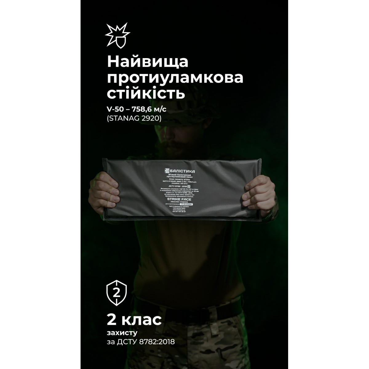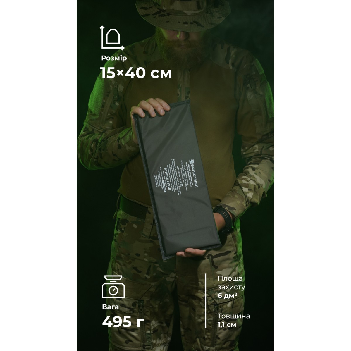 Противоосколочный бронепакет устанавливается внутрь бокового кармана к камербанду и обеспечивает защиту мягких тканей и внутренних органов в зоне боков. Подходит под боковые карманы размером 15×40 см. ℹ️ Внимание! Бронепакеты реализуются поштучно, поэтому для полного комплекта боковой защиты вам требуются две штуки ✅ Ключевые преимущества Самые высокие показатели противоосколочной стойкости: бронепакет из 50 слоев СВМПЭ держит осколки со скоростью 758,6 м/с (STANAG 2920 V50) Сырье мирового уровня: СВМПЭ от FMS (Израиль) Уменьшает запреградную травму: СВМПЭ от FMS имеет плотное перекрестное наложение волокон, что уменьшает вдавливание брони с внутренней стороны Соответствует 2-му классу защиты по ДСТУ 8782:2018 Запаян в герметичный чехол, который защищает от влаги, грязи и ультрафиолета Описание товара Наши бронепакеты созданы прежде всего для защиты от осколков, которые являются наиболее распространенной угрозой на фронте. Изделия имеют самые высокие показатели противоосколочной стойкости и результаты по показателю V50 (STANAG 2920, ДСТУ 8782:2018) в своем классе. Сверхвысокомолекулярный полиэтилен (СВМПЭ), из которого они изготовлены, является легким, гибким и одновременно очень прочным материалом. Выдерживают выстрел 9×18 мм (9 mm Makarov), 9×19 мм (9 mm Luger, 9 mm Parabellum) из пистолетов и карабинов в пистолетном патроне и 7,62×25 мм (7,62×25 Tokarev). Во время испытаний выдерживает выстрел из автоматического пистолета Стечкина с расстояния 5 м. Защищает от мелких осколков и вторичных поражающих элементов – фрагментов бетона, кирпича, стекла, дерева и т. д. Имеет запреградную деформацию до 22 мм (в среднем 15 мм и меньше). Этому способствует плотное плетение волокон СВМПЭ. Это критически важно для снижения риска контузий без пробития. Ультразвуковая герметизация гарантирует, что бронепакет не потеряет свойств под воздействием пота, дождя, грязи или прямых солнечных лучей. Благодаря правильной прямоугольной форме легко устанавливаются внутрь бокового кармана. Продуманное количество слоев и естественная гибкость материала способствуют тому, что бронепакет адаптируется к форме тела и не мешает в бою. ℹ️ Протокол отстрела бронепакета 2-го класса защиты согласно ДСТУ (STANAG V-50 – 758,6 м/с ) ℹ️ Протокол отстрела бронепакета 2-го класса защиты согласно ДСТУ (8782:2018) ❓ Часто задаваемые вопросы Можно ли использовать бронепакет с другими подсумками? Да, если они соответствуют по размерам этому бронепакету. Имеет ли этот бронепакет срок годности? Теряет ли он свои характеристики со временем при хранении в домашних условиях (например, не под солнцем и не под дождем)? Наши бронепакеты герметично запаяны. Если герметичность не нарушена, а условия хранения не экстремальные, бронепакет сохраняет свои свойства более 10 лет. Можно ли дальше использовать баллистический пакет, если была нарушена герметичность упаковки? Это крайне нежелательно. Если вода попадет между слоями полиэтилена, изделие может потерять свои защитные свойства. В результате гидроудара вода раздвигает волокна, что увеличивает запреградную травму и даже создает риск пробития. Поэтому обязательно проверяйте герметичность упаковки бронепакета. В случае ее повреждения вы можете отправить бронепакет нам – и мы бесплатно восстановим герметичность упаковки. Можно ли дальше использовать баллистический пакет, если он был п