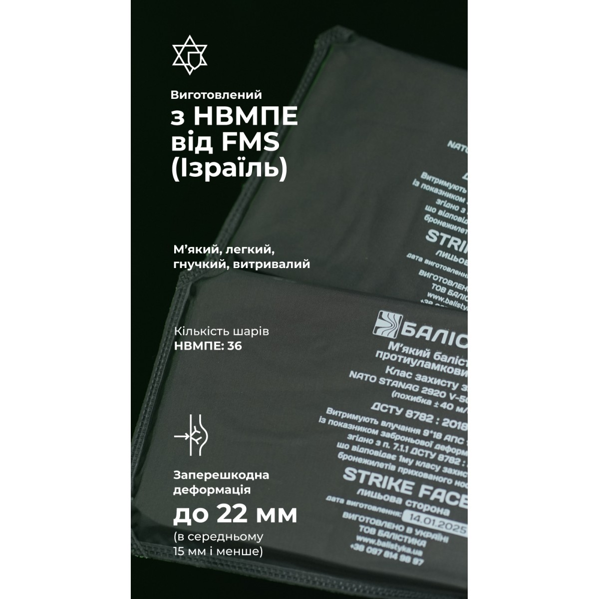 Бронепакеты для камербандов к плитоноске WAS LPC обеспечивают защиту мягких тканей и внутренних органов от попаданий по бокам. ✅ Ключевые преимущества Самые высокие показатели противоосколочной стойкости: бронепакет из 36 слоев СВМПЭ держит осколки со скоростью 614,5 м/с (STANAG 2920 V50) Сырье мирового уровня: СВМПЭ от FMS (Израиль) Уменьшает запреградную травму: СВМПЭ от FMS имеет плотное перекрестное наложение волокон, что уменьшает вдавливание брони с внутренней стороны Соответствует 1-му классу защиты по ДСТУ 8782:2018 Запаян в герметичный чехол, который защищает от влаги, грязи и ультрафиолета Описание товара Наши бронепакеты созданы прежде всего для защиты от осколков, которые являются наиболее распространенной угрозой на фронте. Изделия имеют самые высокие показатели противоосколочной стойкости и результаты по показателю V50 (STANAG 2920, ДСТУ 8782:2018) в своем классе. Сверхвысокомолекулярный полиэтилен (СВМПЭ), из которого они изготовлены, является легким, гибким и одновременно очень прочным материалом. Бронепакет устойчив к поражению пулями калибра 9×18 мм (9 мм Makarov), 9×19 мм (9 мм Luger, 9 мм Parabellum), 9×19 (мм), что соответствует 1-му классу защиты по ДСТУ 8782:2018. Во время испытаний выдерживает выстрел из автоматического пистолета Стечкина и пистолета Glock 17 пулей со свинцовым сердечником с расстояния 10 м. Защищает от мелких осколков и вторичных поражающих элементов – фрагментов бетона, кирпича, стекла, дерева и т. д. Разработаны специально под боковые карманы в размере М до плитоноски LPC. При необходимости могут использоваться с другими защитными модулями, если совпадают с ними по параметрам. Имеет запреградную деформацию до 22 мм (в среднем 15 мм и меньше). Этому способствует плотное плетение волокон СВМПЭ. Это критически важно для снижения риска контузий без пробития. Ультразвуковая герметизация гарантирует, что бронепакет не потеряет свойства под влиянием пота, дождя, грязи или прямых солнечных лучей. Продуманное количество слоев и естественная гибкость материала способствуют тому, что бронепакет адаптируется к форме тела и не мешает в бою. ℹ️ Протокол отстрела бронепакета 1-го класса защиты согласно ДСТУ (STANAG V50 – 614,5 м/с) ℹ️ Протокол отстрела бронепакета 1-го класса защиты согласно ДСТУ (8782:2018 ) ❓ Часто задаваемые вопросы Имеет ли этот бронепакет срок годности? Утрачивает ли характеристики со временем при хранении в домашних условиях (например, не под солнцем и не под дождем)? Наши бронепакеты герметично запаяны. Если герметичность не нарушена, а условия хранения не экстремальны, бронепакет сохраняет свои свойства более 10 лет. Можно ли дальше использовать баллистический пакет, если была нарушена герметичность упаковки? Это крайне нежелательно. Если вода попадет между слоями полиэтилена, изделие может потерять свои защитные свойства. В результате гидроудара вода раздвигает волокна, что увеличивает запреградную травму и даже создает риск пробития. Поэтому обязательно проверяйте герметичность упаковки бронепакета. В случае ее повреждения вы можете отправить бронепакет нам – и мы бесплатно восстановим герметичность упаковки. Можно ли дальше использовать баллистический пакет, если он был поражен? «Баллистика» не рекомендует использовать баллистический пакет в случае поражения. Это снижает эффективную площадь защиты и увеличивает вероятность 