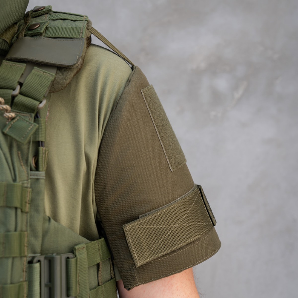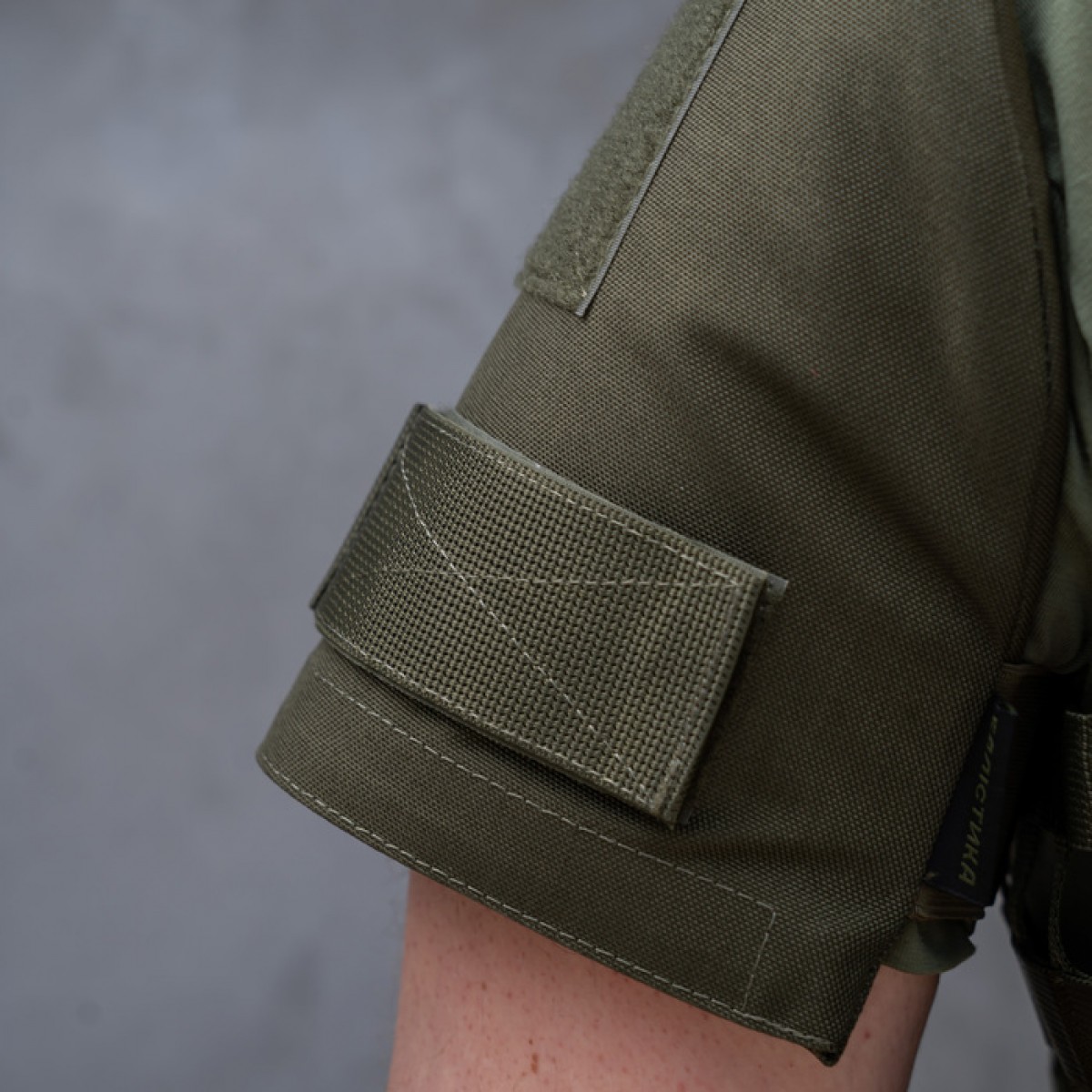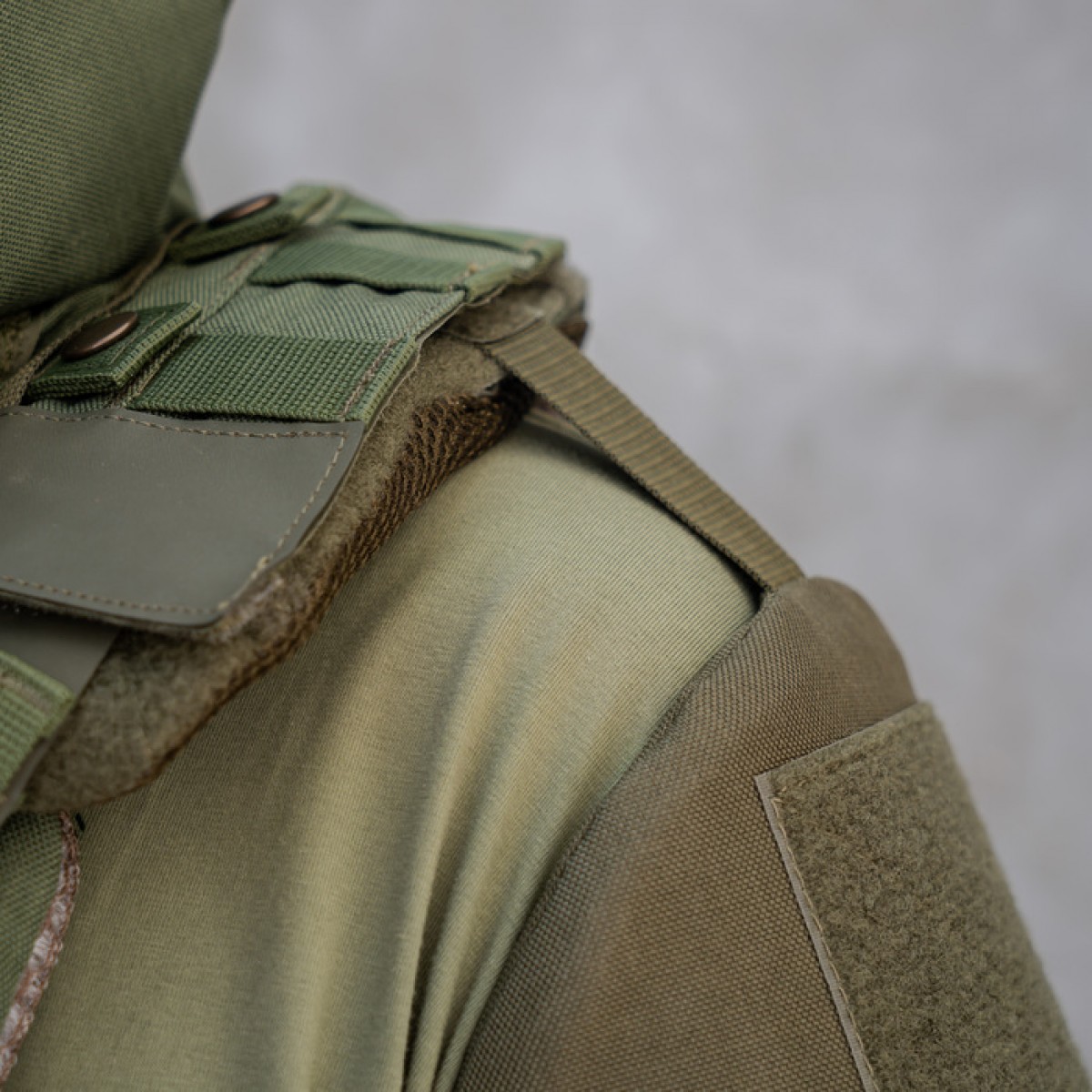 В современной войне 80% потерь личного состава является результатом осколочных ранений. Модуль защиты плеч от «Баллистика» с баллистическими пакетами 1-го класса по ДСТУ 8782:2018 обеспечит эффективное противодействие таким повреждениям. Это изделие защищает магистральные артерии, сосуды и плечевые суставы от мелких осколков (фрагментов вогов, мин, суббоеприпасов от кассетных снарядов и т. д.) и вторичных поражающих элементов (кусков камней, дерева, металла, которые образуются при взрывах). Особенности товара При правильной установке и настройке этот модуль защищает самую уязвимую и сложную область руки – плечевой сустав. Среди других особенностей изделия можно перечислить следующие: Имеет форму купола, благодаря чему плотно прилегает к телу, повторяя анатомические изгибы плеча, и не конфликтует с другими частями снаряжения. К плитоноске крепится с помощью велкро-хлястика, который устанавливается внутрь плечевой лямки. Модуль может применяться на различных плитоносках, где на лямках также есть велкро-клапан. На плече изделие фиксируется с помощью горизонтальной стропы-утяжки с велкро (46×5 см), благодаря которой можно регулировать его обхват. Эластичная лента, которая является компонентом крепления, способствует адаптации модуля к сокращениям мышц. На внешней стороне помещены две велкро-панели размером 22×5 и 10×10 см. Первая предназначена, собственно, для фиксации стропы, вторая – для шевронов. Доступ к бронепакету расположен снизу широкого края и закрывается клапаном с липучкой. Подходит для плитоносок серии M3 Pro/Lite и бронежилета «Сармат», может работать с модулем защиты шеи «Пелерина». Баллистический пакет, соответствующий 1-му классу защиты по ДСТУ 8782:2018, изготовлен из СВМПЭ и имеет показатель NATO STANAG 2920 V-50 = 614,5 м/с. Протокол отстрела бронепакетов 1-го класса защиты согласно ДСТУ (STANAG V-50 – 614,5 м/c). Последовательность закрепления Чтобы правильно зафиксировать модуль на плече, следует придерживаться такого алгоритма действий: Открыть клапаны на плечевых лямках плитоноски или бронежилета и добраться до велкро на них. Ровно разместить модуль плечевой защиты относительно руки и плеча, отрегулировать по высоте и закрыть клапан. Отрегулировать изделие по ширине руки с помощью стропы-утяжки. Зафиксировать утяжку на велкро-панели таким образом, чтобы обхват обеспечивал плотное прилегание и одновременно оставался комфортным при длительном ношении. Технические характеристики Материал: Cordura 1000D. Липучка: Velcro. Стропа: нейлон, 2,5; 5 см. Фурнитура: пластиковые кольца, 6 см (2М). Размеры: 30×24 см. Вес (пара): 860 г. Площадь защиты (пара): 10,8 дм2.Основные характеристики Защита плеч с баллистической защитой 1 класса (Олива)