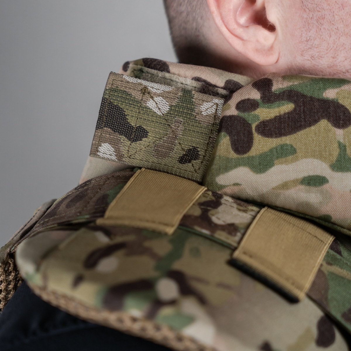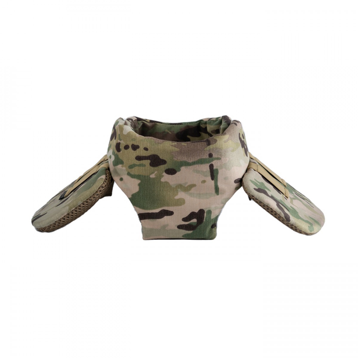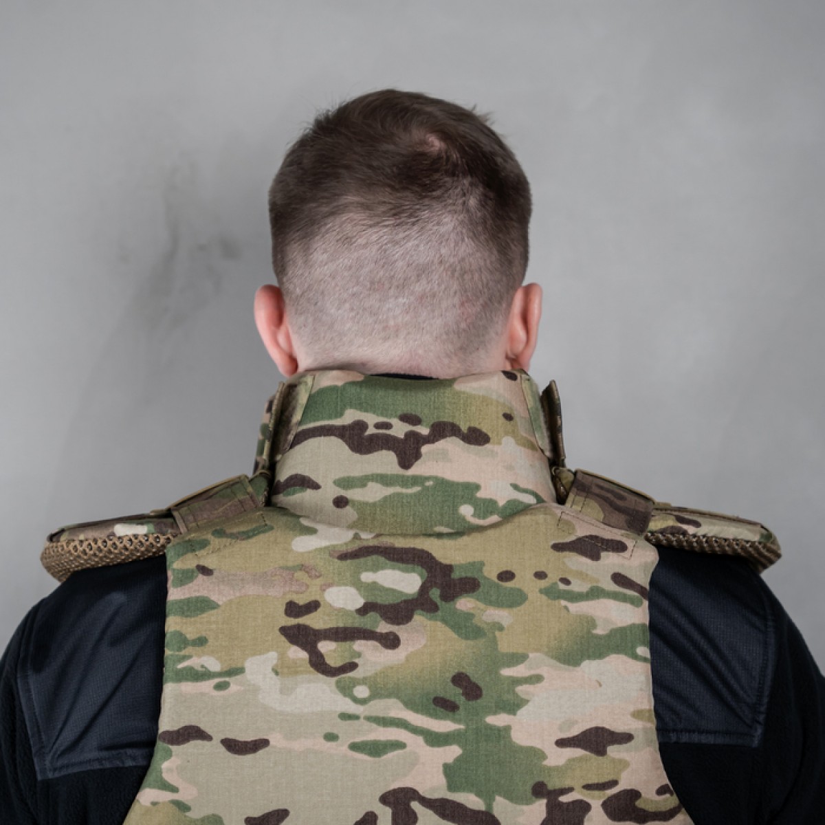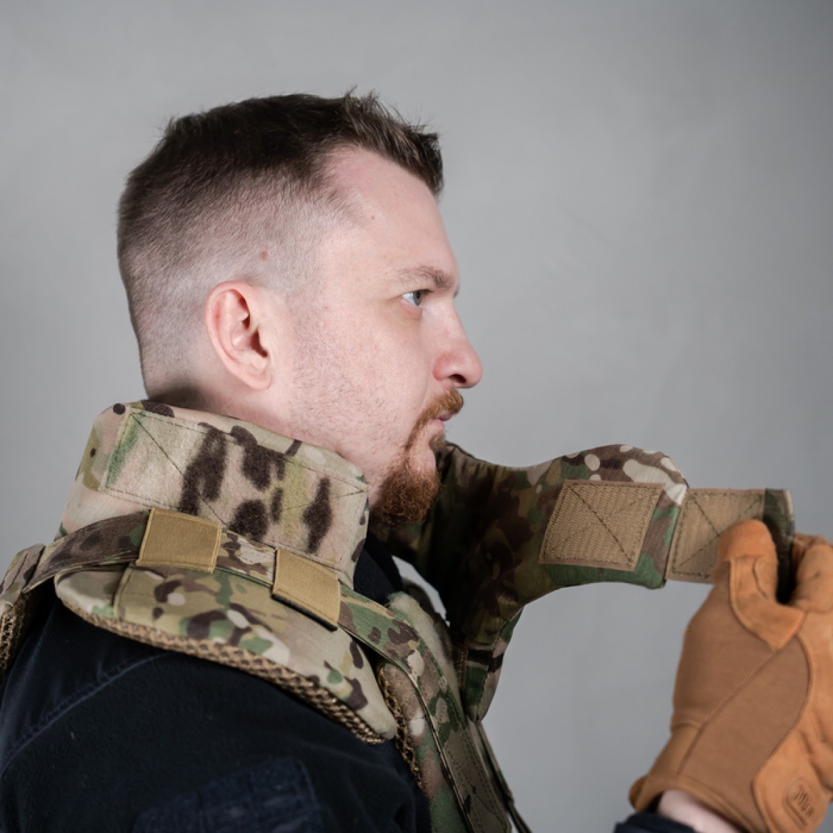 Модуль защиты плеч и шеи специально создан для бронежилета скрытого ношения «Сорочка». ✅ Ключевые преимущества Совместим с бронежилетом «Сорочка» Крепится на велкро Регулируется по обхвату Эластичные стропы для продевания лямок бронежилета Оснащен бронепакетом 1-го класса защиты по ДСТУ 8782:2018 Сырье мирового уровня: СВМПЭ от FMS (Израиль) Показатель противоосколочной стойкости бронепакета V50 – 614 м/с (STANAG 2920) Площадь защиты 11,95 дм² Описание товара Защита плеч и шеи имеет совместимые с бронежилетом «Сорочка» крепления, которые позволяют индивидуально настроить посадку. Состоит из четырех элементов: ✔️ Перед и спинка, которые защищают шею и ключицы. ✔️ Две боковины, которые покрывают верхние участки плеч. Спереди и сзади крепится к бронежилету на велкро. А сквозь эластичные крепления на боковых частях продеваются его лямки. Плотность прилегания переда и спинки к шее можно отрегулировать, если изменить положение липучки в месте их фиксации между собой (по бокам от головы). Внутренняя сторона боковин выполнена из 3D-сетки, которая отводит лишнее тепло и облегчает давление на плечи. В каждой части внутри содержатся отдельные баллистические пакеты 1-го класса защиты из СВМПЭ, изготовленного в Израиле компанией FMS. ✔️ Показатель их противоосколочной стойкости (V-50) составляет 614,5 м/с. ✔️ Во время испытаний выдерживают выстрелы из автоматического пистолета Стечкина пулей со свинцовым сердечником с расстояния 5 м. ℹ️ Протокол отстрела бронепакета 1-го класса защиты согласно ДСТУ (STANAG V50 – 614,5 м/с) ℹ️ Протокол отстрела бронепакета 1-го класса защиты согласно ДСТУ (8782:2018) Бронепакеты уменьшают запреградную травму: СВМПЭ имеет плотное перекрестное наложение волокон, что уменьшает вдавливание брони с внутренней стороны. Каждый бронепакет запаян в герметичную упаковку, которая защищает от влаги, грязи и ультрафиолета. ❓ Часто задаваемые вопросы Подойдет ли эта защита плеч к бронежилету «Сармат» или плитоноске М3 Pro? Нет, не подойдет. Она совместима только с бронежилетом «Сорочка». К М3 Pro идет собственный адаптированный модуль защиты шеи « Пелерина ». Какой класс защиты? 1-й класс защиты по ДСТУ 8782:2018. Какой вес? 915 г.Основные характеристики Защита плечей и шеи для Сорочки (Мультикам)