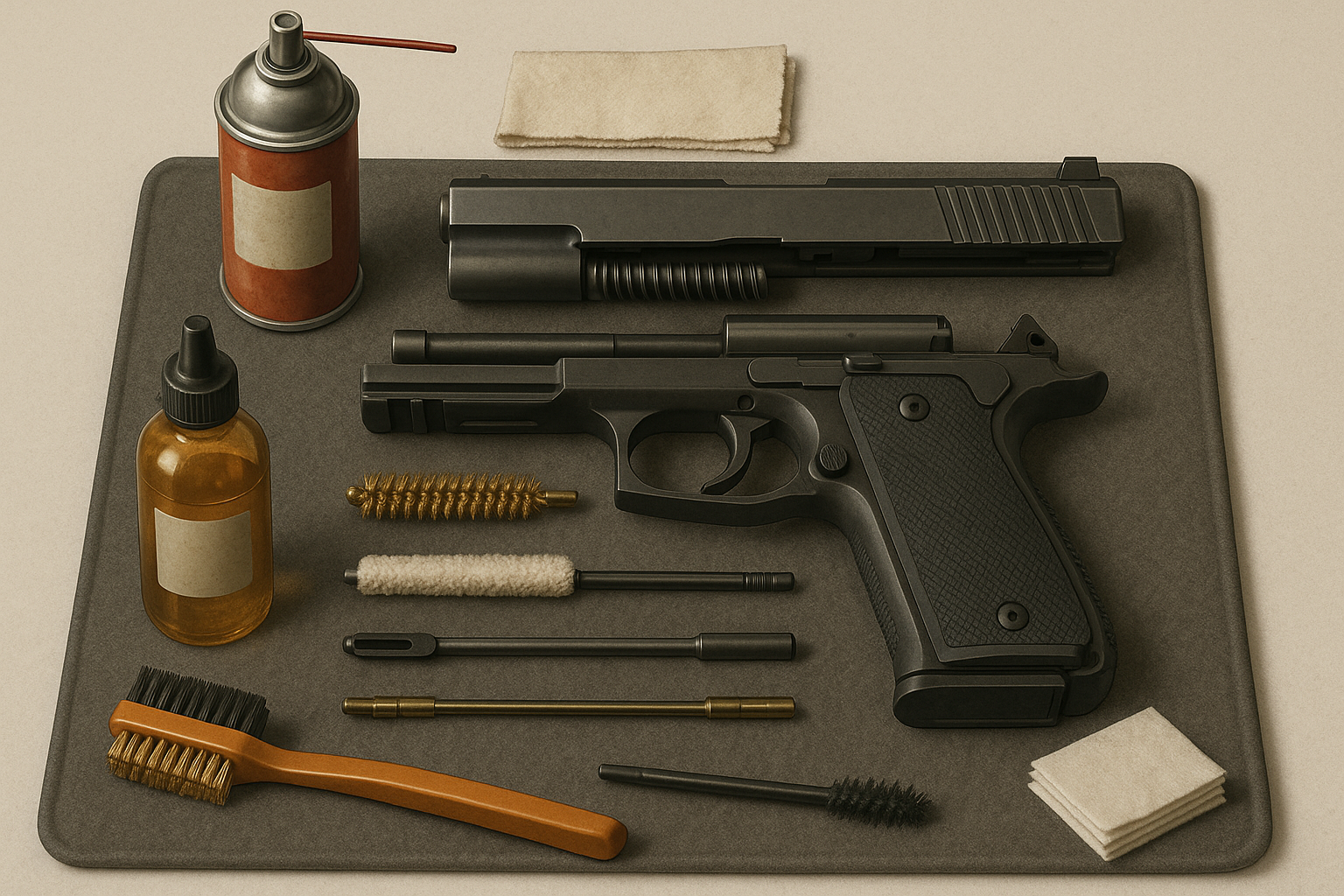 - Подготовка и проверка безопасности — направьте оружие в безопасную сторону, выньте магазин, отведите затвор назад и трижды проверьте патронник. Убедитесь, что поблизости нет патронов. Подготовьте инструменты и химию.