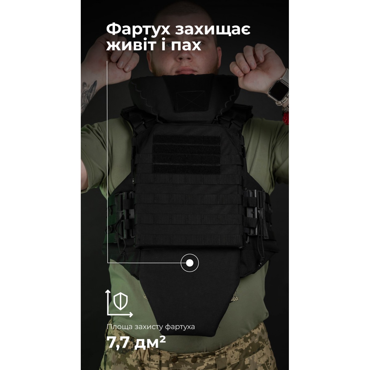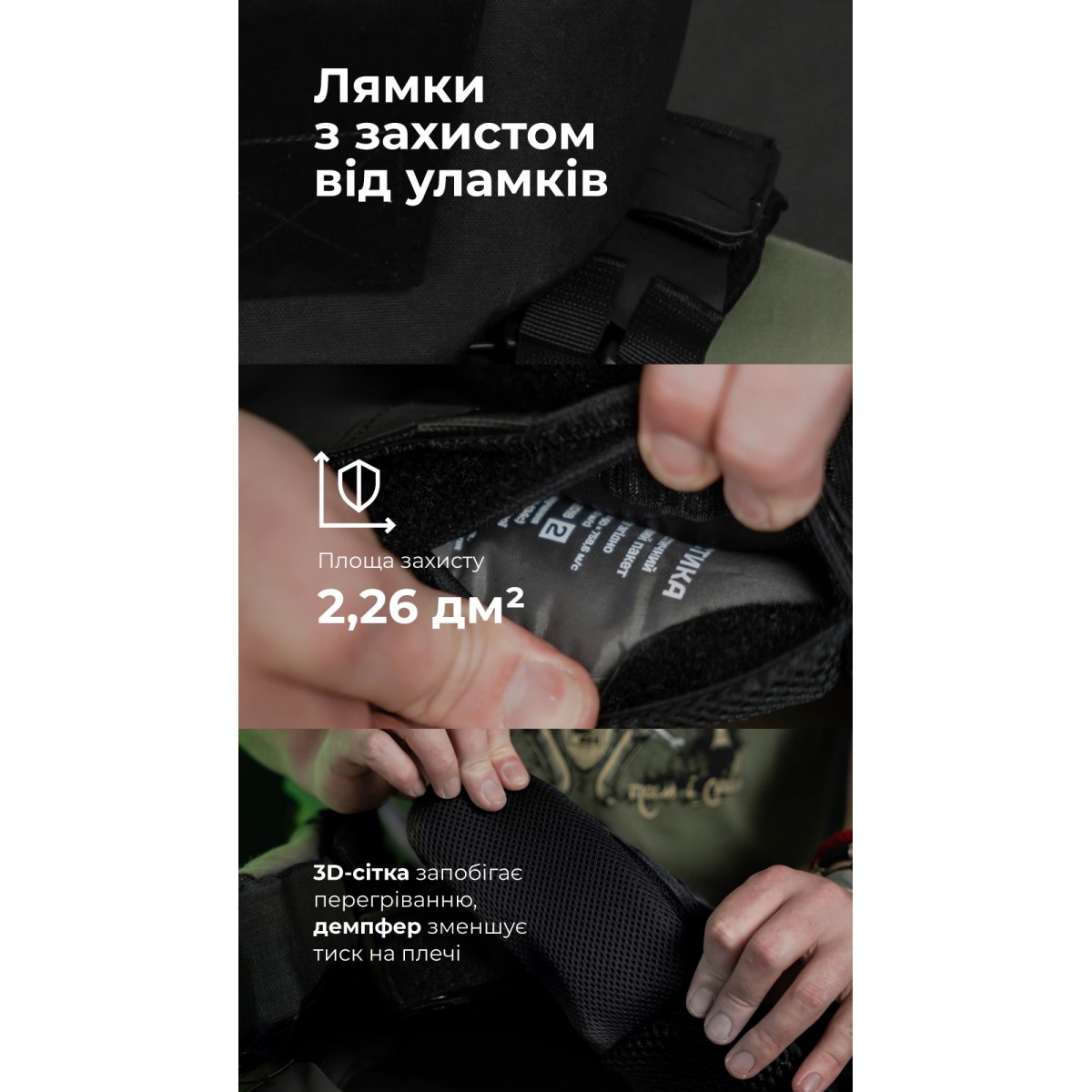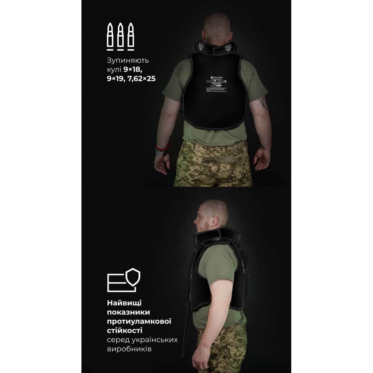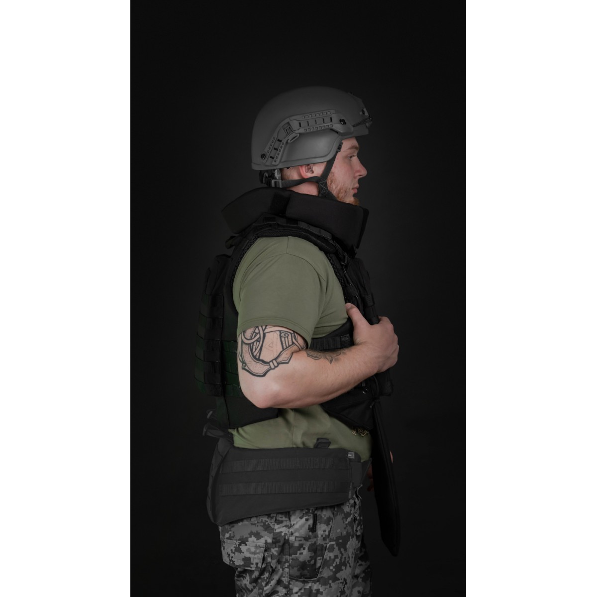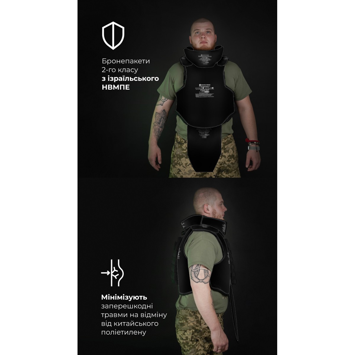Бронежилет «Сармат» оснащен мягкими бронепакетами 2-го класса защиты согласно ДСТУ 8782:2018. Они изготовлены из качественного израильского СВМПЭ, который отличается малым весом и эффективно останавливает осколки. Мягкая бронезащита в нашем изделии покрывает не только грудь и спину, но и шею, ключицы, живот и пах. Подвижный фартук и отсоединяемый воротник позволяют настроить бронежилет в соответствии с задачей и существенно увеличивают площадь защиты. Ключевые преимущества бронежилета Высокий уровень защиты сразу Бронежилет комплектуется баллистическими пакетами 2-го класса из СВМПЭ от FMS. Благодаря этому значительно уменьшается риск пробития и минимизируются запреградные травмы. Кроме того, наши бронепакеты имеют самые высокие показатели противоосколочной стойкости среди других производителей. Большая площадь защиты – 49,28 дм2 В конструкции предусмотрено расширенное покрытие жизненно важных зон – шеи, ключиц, живота и паха – уже в базовой комплектации. Обновленный модуль защиты шеи По сравнению с предыдущей версией новая обеспечивает лучший комфорт. Разрез на задней части расходится под давлением шлема, что способствует свободному движению головы. При этом шлем меньше сдвигается вперед и не наезжает на лоб и глаза. Края разреза накладываются друг на друга, так что в обычном положении между ними нет щели, в которую может попасть осколок. Кроме того, изнутри бортики обшиты мягким велкро и не натирают кожу. Система экстренного сброса Система позволяет за секунду разделить бронежилет на переднюю и заднюю части. Механизм состоит из стальных тросов, продетых сквозь желобки по периметру переднего кармана под плиту. Он активируется двумя скрытыми хлястиками. Также предусмотрена возможность сброса на одну или другую сторону. Материалы, рассчитанные на максимальную выносливость В производстве использованы прочные износостойкие материалы – нейлон 1000D (аналог Cordura), гиполон, 3D-сетка – и проверенная фурнитура (AMM), которые выдерживают интенсивную эксплуатацию в условиях боевых действий. Это гарантирует долговечность, надежность, устойчивость к влаге, пыли и механическим воздействиям. Особенности товара Баллистическая защита Бронежилет оснащен мягкой бронезащитой 2-го класса защиты общей площадью 49,28 дм2 и весом 5,6 кг (без бронеплит). Материал для бронепакетов – сверхвысокомолекулярный полиэтилен (СВМПЭ) – производится израильской компанией FMS. Показатель их противоосколочной устойчивости (V-50) составляет 758,6 м/с. Выдерживают выстрел 9×18 мм (9 mm Makarov), 9×19 мм (9 mm Luger, 9 mm Parabellum) из пистолетов и карабинов в пистолетном патроне и 7,62×25 мм (7,62×25 Tokarev). Протокол отстрела 2-й класс защиты согласно ДСТУ (STANAG V-50 – 758,6 м/с). Протокол отстрела «Сармат» 2-й класс согласно ДСТУ. Бронеплиты Кроме отсеков для мягких бронепакетов, «Сармат» оснащен фронтальным и тыльным карманами для бронеплит. Они рассчитаны на комплектацию стандартными пластинами размером 25×30 см со скошенными верхними углами толщиной до 3 см. Также совместимы с пластинами SAPI M и ESAPI M. Бронежилет совместим со всеми бронеплитами размером 25×30, которые можно приобрести в магазинах «Баллистика»: Анатомическая полиэтиленовая бронеплита с демпфером (3 класс защиты | 1.6 кг | 25х30 см | СВМПЭ). Бронепластина 6-го класса защиты керамическая. Материалы Бронежилет изготовлен из прочного, износост