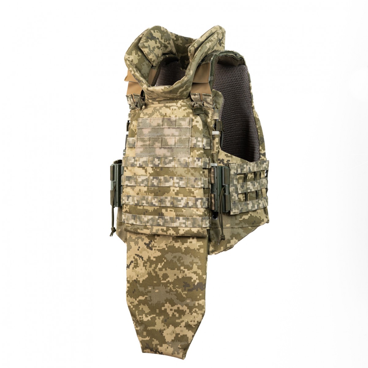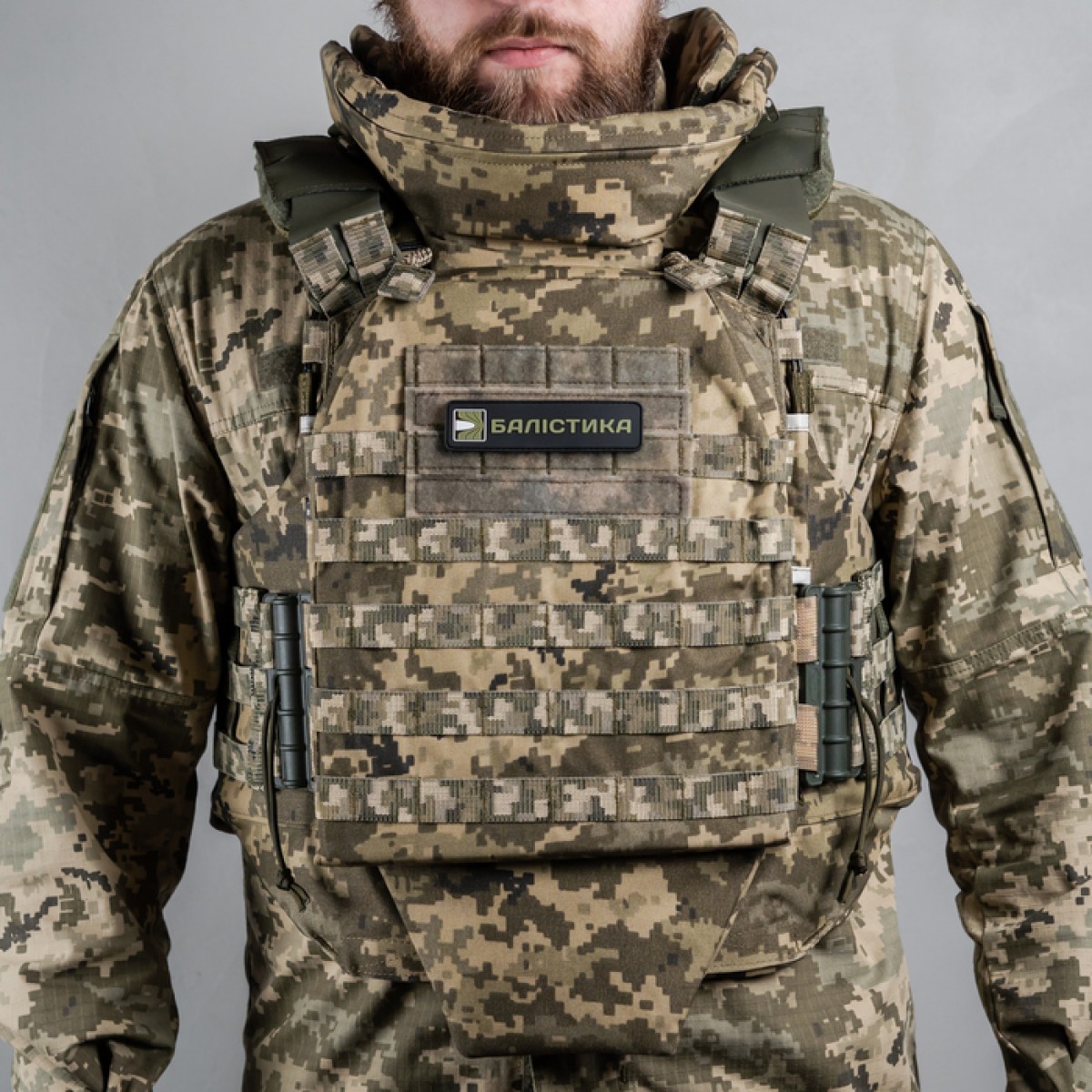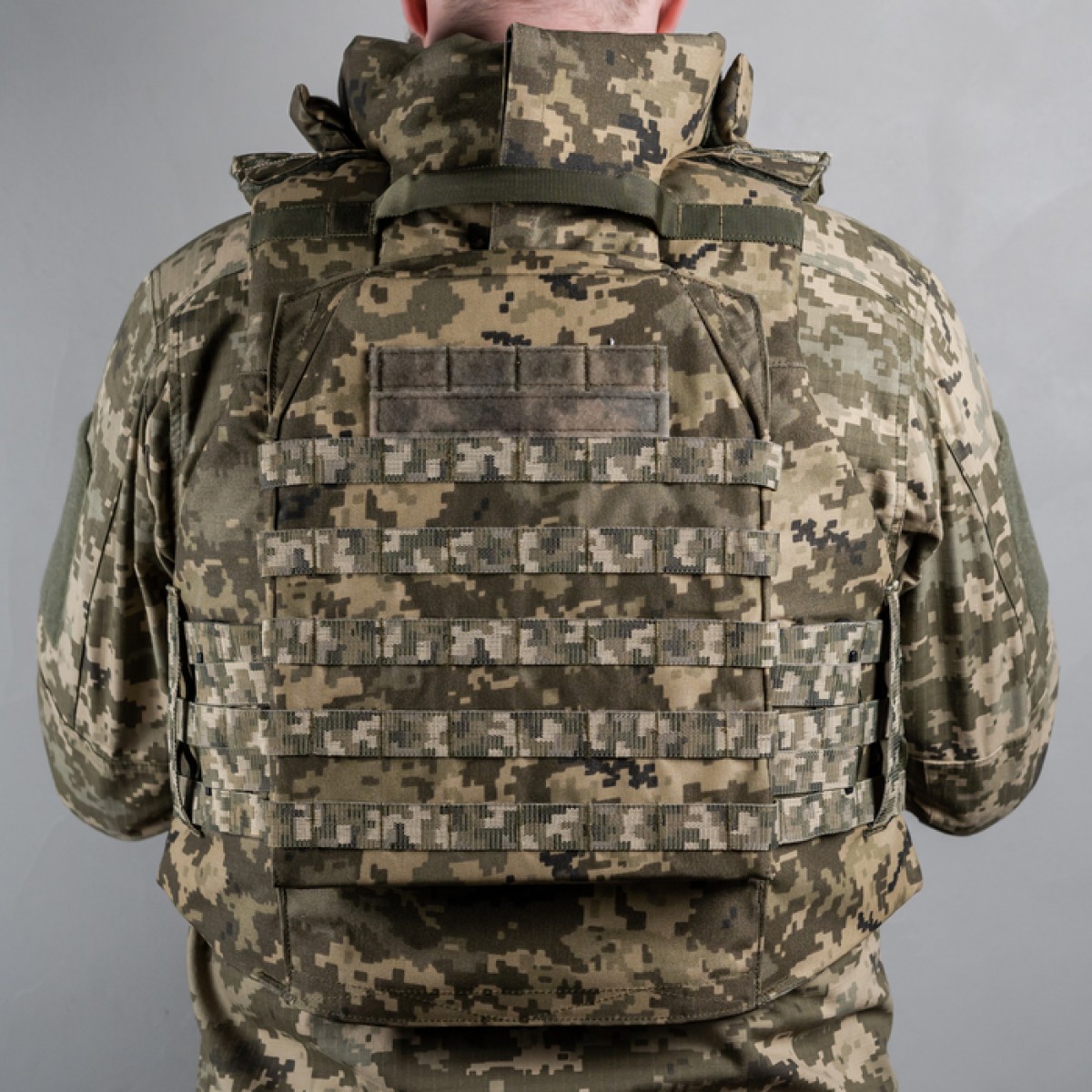 Бронежилет «Сармат» – это высокотехнологичное средство индивидуальной защиты от украинского производителя. Он мобильный, удобный и адаптирован к требованиям современной войны благодаря противодействию осколкам. Передовые материалы и инновационные производственные решения обеспечивают большую площадь защиты (58,5 дм2) и минимальный вес относительно габаритов (5,25 кг без бронепластин). «Сармат» пригоден для различных типов ведения штурмовых и боевых действий в условиях окопной и позиционной войны. Он позволяет сохранять высокую маневренность, отличается меньшей утомляемостью. А благодаря возможности установить бронеплиты разного класса защиты бронежилет обеспечивает адаптивность к угрозам, с которыми может столкнуться боец на поле боя. Универсальность защиты Подходит для различных родов войск, таких как: Пехота: бойцы на передовой могут беспрепятственно маневрировать и комфортно вести огонь как из легкого, так и из тяжелого стрелкового оружия, имея при этом надежную защиту. Артиллерия: бронежилет станет незаменимым элементом экипировки для артиллеристов, которые находятся на передовой и нуждаются в защите от элементов поражения и осколков. Саперы: бронежилет подходит для военных специалистов по разминированию позиций. Ведь обеспечивает эффективную защиту от осколков и при этом сохраняет необходимую подвижность для выполнения точных технических задач. Силы специальных операций: позволяет выполнять задачи в условиях высокой динамики боевых действий, включая штурмовые и контрштурмовые операции. Мобильно-огневые группы: воины могут использовать бронежилет во время постоянного пребывания на огневых позициях, поскольку он не ограничивает движений и позволяет быстро реагировать на изменение боевой обстановки. Основные преимущества бронежилета При выборе бронежилета важно учитывать не только его защитные свойства, но и комфорт, мобильность и функциональность. Вот главные особенности, которые делают этот бронежилет оптимальным выбором для военных и спецназовцев: Легкость и удобство. Благодаря использованию современных материалов бронежилет имеет минимальный вес (5,25 кг), не ограничивает движений и обеспечивает комфортное ношение в течение длительного времени. Экстренный сброс. Бронежилет «Сармат» оснащен запатентованной системой экстренного сброса, которая позволяет легко и быстро снять его в случае необходимости. Оптимальная площадь защиты. Бронежилет защищает не только сердце и легкие, но и шею и пах. Модульная система. Она дает возможность добавить защиту плеч и бедер для большей баллистической защиты. Высококачественные материалы. Использование прочных и износостойких материалов (Cordura 1000D, полиамидные стропы, фурнитура из прочного пластика, 3D-сетка для вентиляции и т. д.). Воротник и фартук. Имеют удобную систему крепления/разъединения. Воротник является цельнокроеным, не имеет швов в месте сгибания и крепится при помощи липучки на перехлест к мягкой броне жилета. Фартук регулируется по высоте и в случае необходимости прячется под бронеплиту. Компоненты бронежилета 1. Чехол бронежилета: Совместим с бронеплитами – подходит для плит размером 27×33 см (SAPI/ESAPI L) и толщиной до 3 см. Имеет систему MOLLE – позволяет крепить дополнительное снаряжение, например подсумки, карманы для боковой защиты, рюкзак под г