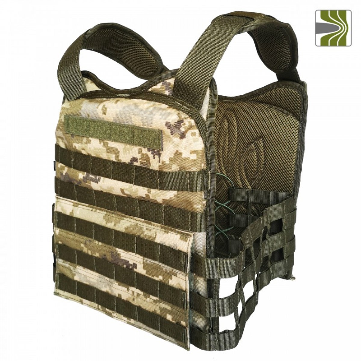 Отличительной чертой данного Plate carrier являются: Специальная технология прострочки велкро на передней части плитоноски (клапан камербанда), что полностью защищает ее от отрыва. Слой 3D сетки который обеспечивает комфорт ношения и качественную вентиляцию. Сама стенка оснащена вышитым гербом Украины на всю площадь поверхности; Система крепления камербанда располагается на внутренней части задней стенки плитоноски;