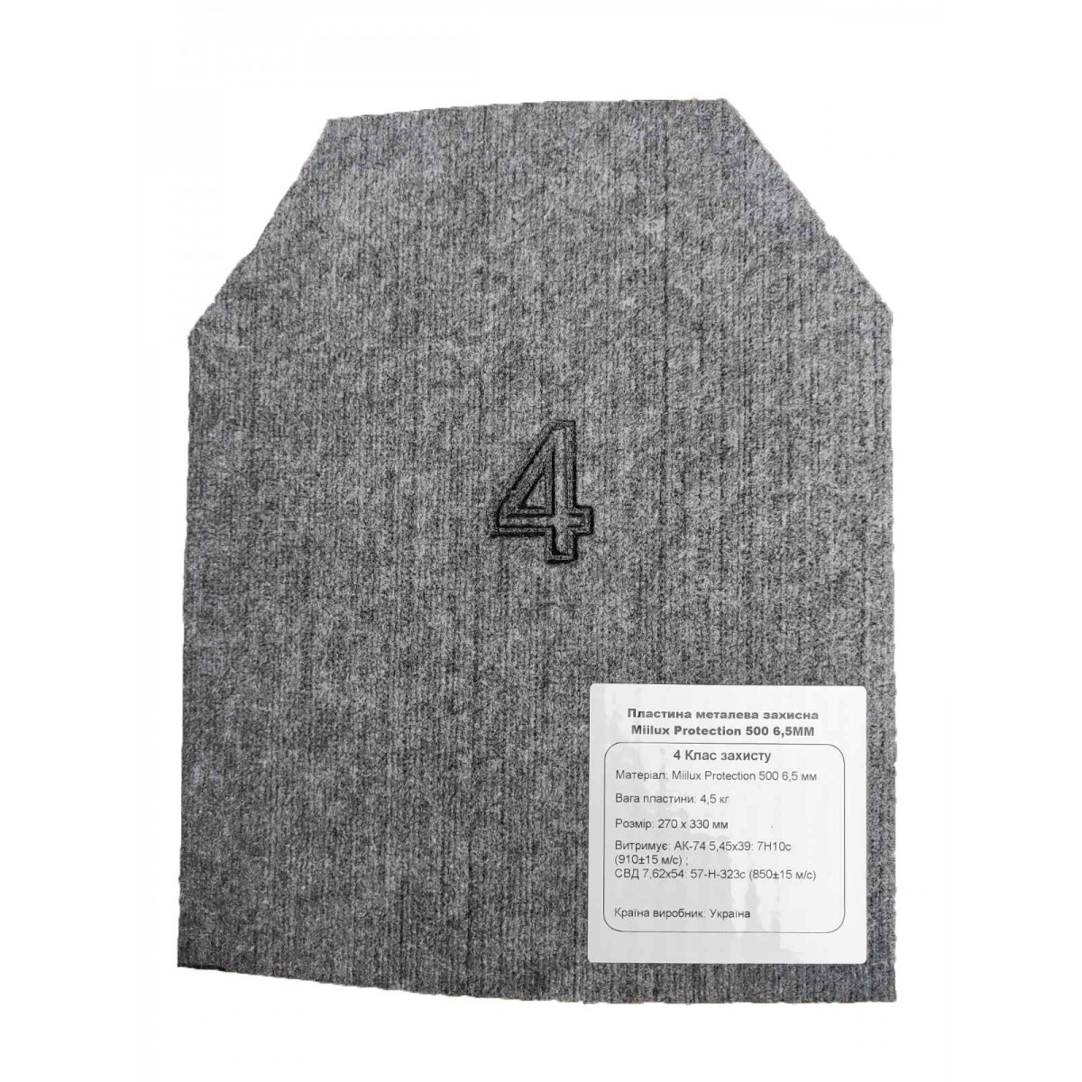 Описание Бронеплита 4-го класса защиты Miilux Protection 270x330 мм увеличенная 500-6,5 мм вес 4.5кг