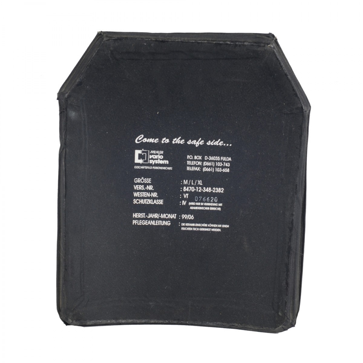 Бронеплита Mehler с немецким классом защиты SK4 который эффективен до калибра.308 Winchester VMS/HK (скорость пули от 830 м/с и вес до 9,75 грамм) от немецкого производителя производителя Mehler Vario System. В июне 1998г НАТО (и армия ФРГ в составе блока) начинает операцию против Югославии. В это же время Немецкая компания Mehler Vario Systems выигрывает конкурс по поставке Бундесверу бронежилетов для линейных подразделений (Mehler ST) и бронежилетов для спецподразделений (Mehler SK). Габариты плиты: 30 х 25 см