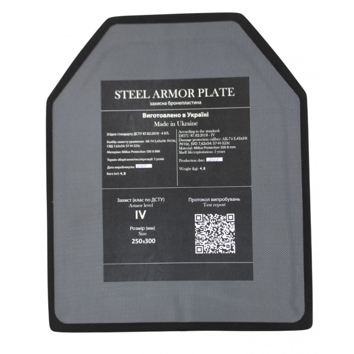 ⭐ Комплектация Бронеплита 4-й класс защиты Miilux Protection 500 8 мм (размер 250х300 мм, вес 4.8 кг)