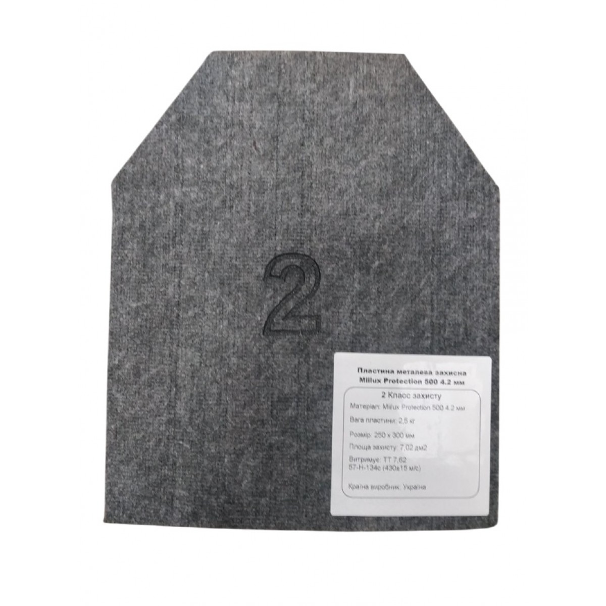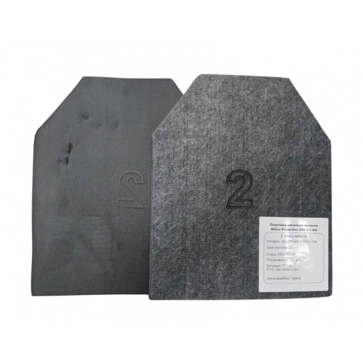 Комплект из двух бронепластин изготовлен из прочной стали Miilux Protection 500 толщиной 4,2 мм, обеспечивающей надежный уровень защиты 2-го класса по стандартам.