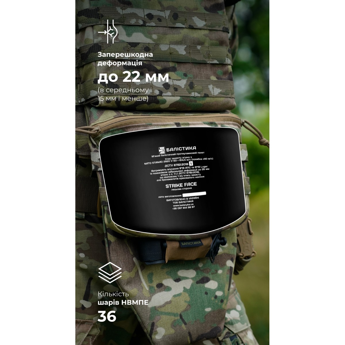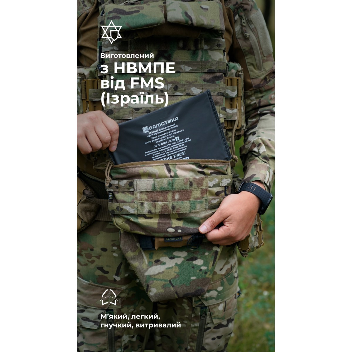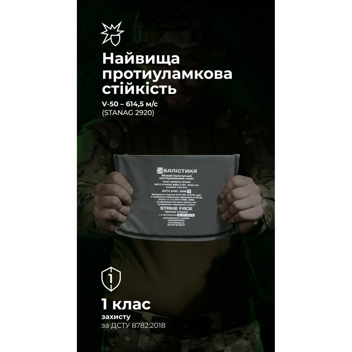 Баллистический пакет 1-го класса защиты делает из «Ладника» не просто удобную сумку, а полноценный модуль защиты площадью 3,54 дм². ✅ Ключевые преимущества Самые высокие показатели противоосколочной стойкости: бронепакет из 36 слоев СВМПЭ держит осколки со скоростью 614,5 м/с (STANAG 2920 V50) Сырье мирового уровня: СВМПЭ от FMS (Израиль) Уменьшает запреградную травму: СВМПЭ от FMS имеет плотное перекрестное наложение волокон, что уменьшает вдавливание брони с внутренней стороны Соответствует 1-му классу защиты по ДСТУ 8782:2018 Запаян в герметичный чехол, который защищает от влаги, грязи и ультрафиолета Описание товара Наши бронепакеты созданы прежде всего для защиты от осколков, которые являются наиболее распространенной угрозой на фронте. Изделия имеют самые высокие показатели противоосколочной стойкости и результаты по показателю V50 (STANAG 2920, ДСТУ 8782:2018) в своем классе. Сверхвысокомолекулярный полиэтилен (СВМПЭ), из которого они изготовлены, является легким, гибким и одновременно очень прочным материалом. Бронепакет устанавливается в задний карман «Ладника». Благодаря точно подогнанному размеру плотно фиксируется внутри и не сдвигается во время движения. Устойчив к поражению пулями калибра 9×18 мм (9 мм Makarov), 9×19 мм (9 мм Luger, 9 мм Parabellum), 9×19 (мм), что соответствует 1-му классу защиты по ДСТУ 8782:2018. Во время испытаний выдерживает выстрел из автоматического пистолета Стечкина и пистолета Glock 17 пулей со свинцовым сердечником с расстояния 10 м. Защищает от мелких осколков и вторичных поражающих элементов – фрагментов бетона, кирпича, стекла, дерева и т. д. Имеет запреградную деформацию до 22 мм (в среднем 15 мм и меньше). Этому способствует плотное плетение волокон СВМПЭ. Это критически важно для снижения риска контузий без пробития. Ультразвуковая герметизация гарантирует, что бронепакет не потеряет свойств под влиянием пота, дождя, грязи или прямых солнечных лучей. Продуманное количество слоев и естественная гибкость материала способствуют тому, что бронепакет адаптируется к форме тела и не мешает в бою. ℹ️ Протокол отстрела бронепакета 1-го класса защиты согласно ДСТУ (STANAG V50 – 614,5 м/с) ℹ️ Протокол отстрела бронепакета 1-го класса защиты согласно ДСТУ (8782:2018 ) ❓ Часто задаваемые вопросы Имеет ли этот бронепакет срок годности? Утрачивает ли характеристики со временем при хранении в домашних условиях (например, не под солнцем и не под дождем)? Наши бронепакеты герметично запаяны. Если герметичность не нарушена, а условия хранения не экстремальны, бронепакет сохраняет свои свойства более 10 лет. Насколько удобно носить бананку с бронепакетом в течение длительного времени? Бронепакет весит всего 210 г, имеет размер 23×16 см, поэтому благодаря компактности и гибкости не влияет на подвижность. Как ухаживать за бронепакетом? Бронепакет не нуждается в особом уходе. Но стоит время от времени проверять его целостность и заменять в случае необходимости. Его следует хранить в сухом, проветриваемом месте, избегать прямых солнечных лучей и агрессивных веществ, чтобы сохранить защитные свойства на длительное время.Основные характеристики Баллистический пакет для напашника "Ладник" (1 класс | 23×16 см | 210 г | СВМПЭ ✡ Израиль) ТМ Баллистика