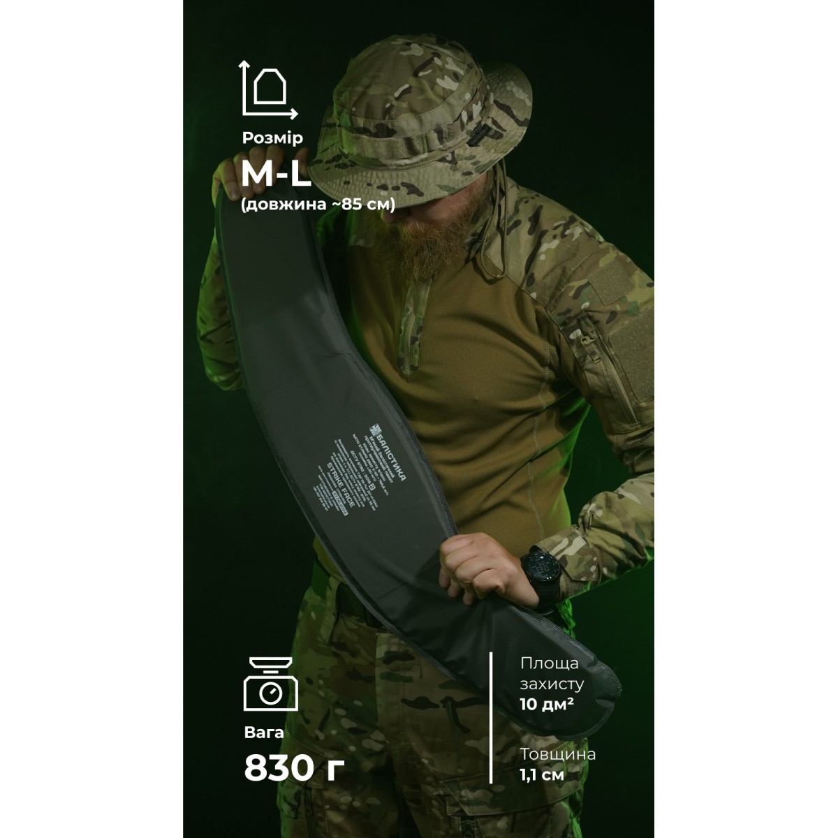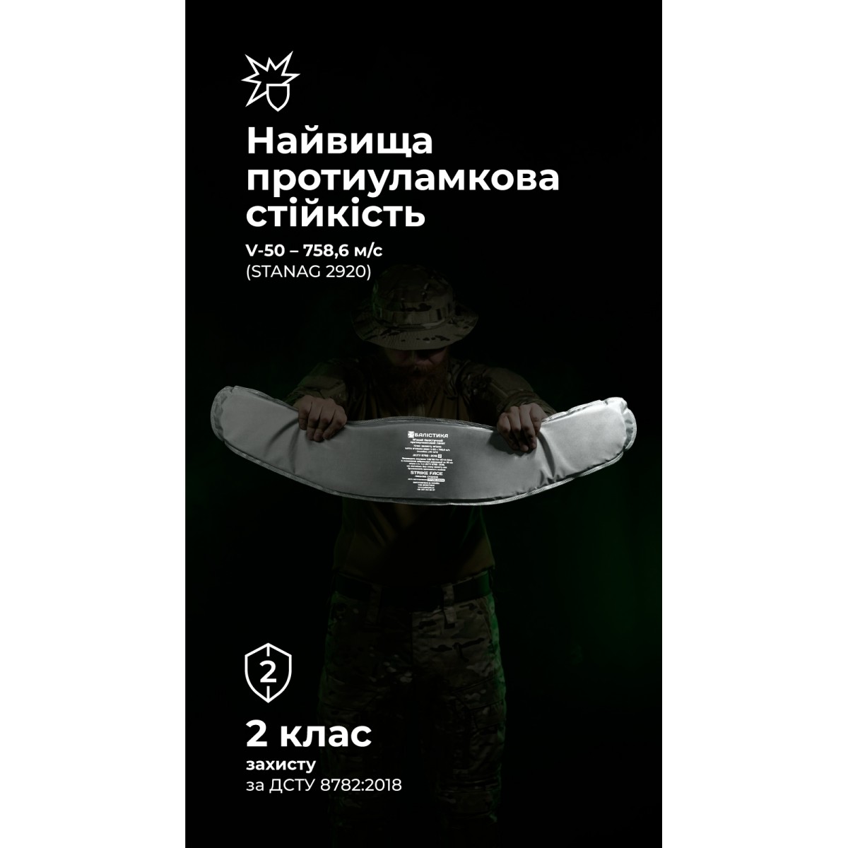 Баллистический пакет 2-го класса защиты для «Черсел» M расширяет площадь защиты снаряжения на 10 дм² и при этом сохраняет полную функциональность разгрузочной системы. ✅ Ключевые преимущества Самые высокие показатели противоосколочной стойкости: бронепакет из 50 слоев СВМПЭ держит осколки со скоростью 758,6 м/с (STANAG 2920 V50) Сырье мирового уровня: СВМПЭ от FMS (Израиль) Уменьшает запреградную травму: СВМПЭ от FMS имеет плотное перекрестное наложение волокон, что уменьшает вдавливание брони с внутренней стороны Соответствует 2-му классу защиты по ДСТУ 8782:2018 Запаян в герметичный чехол, который защищает от влаги, грязи и ультрафиолета Описание товара Наши бронепакеты созданы прежде всего для защиты от осколков, которые являются наиболее распространенной угрозой на фронте. Изделия имеют самые высокие показатели противоосколочной стойкости и результаты по показателю V50 (STANAG 2920, ДСТУ 8782:2018) в своем классе. Сверхвысокомолекулярный полиэтилен (СВМПЭ), из которого они изготовлены, является легким, гибким и одновременно очень прочным материалом. Выдерживает выстрел 9×18 мм (9 mm Makarov), 9×19 мм (9 mm Luger, 9 mm Parabellum) из пистолетов и карабинов в пистолетном патроне и 7,62×25 мм (7,62×25 Tokarev), что соответствует 2-му классу защиты по ДСТУ 8782:2018. Во время испытаний выдерживает выстрел из автоматического пистолета Стечкина и пистолета Glock 17 пулей со свинцовым сердечником с расстояния 10 м. Защищает от мелких осколков и вторичных поражающих элементов – фрагментов бетона, кирпича, стекла, дерева и т. д. Имеет запреградную деформацию до 22 мм (в среднем 15 мм и меньше). Этому способствует плотное плетение волокон СВМПЭ. Это критически важно для снижения риска контузий без пробития. Ультразвуковая герметизация гарантирует, что бронепакет не потеряет свойств под воздействием пота, дождя, грязи или прямых солнечных лучей. Продуманное количество слоев и естественная гибкость материала способствуют тому, что бронепакет адаптируется к форме тела и не мешает в бою. ℹ️ Протокол отстрела бронепакетов 2-го класса защиты согласно ДСТУ (STANAG V-50 – 758,6 м/с ) ℹ️ Протокол отстрела бронепакета 2-го класса защиты согласно ДСТУ (8782:2018) ️ Конструктивные особенности ✔️ Изделие имеет нестандартную форму с расширением в центре и сужением к концам, которая полностью повторяет изгибы и контуры РПС. ✔️ Подходит только под «Черсел» и с разгрузочными системами других производителей не совместим. ✔️ Покрывает область талии и поясницы, однако из-за специфики пояса абдоминальная зона остается почти полностью открытой. Для нее в «Баллистика» предусмотрены отдельные модули защиты. ✔️ Демпферные качества бронеэлемента усиливаются благодаря вставке из пены, которой комплектуется РПС. ❓ Часто задаваемые вопросы Какой смысл ставить бронепакет в РПС, если есть плитоноска? Плитоноска защищает только жизненно важные органы грудной клетки. А бронепакет в РПС покрывает дополнительную зону (талия, бока, поясница), которая также часто подвергается осколочным ранениям. Баллистический пакет нужно устанавливать вместо той пенки, которая идет внутри РПС, или вместе с ней, поверх? Мы рекомендуем не вынимать пену, если вы используете этот бронепакет. Она служит как дополнительный демпфер. Пена должна находиться ближе к телу, затем бронепакет. Нужно ли вынимать бронепакет перед стиркой РПС? Да, пакет не предна