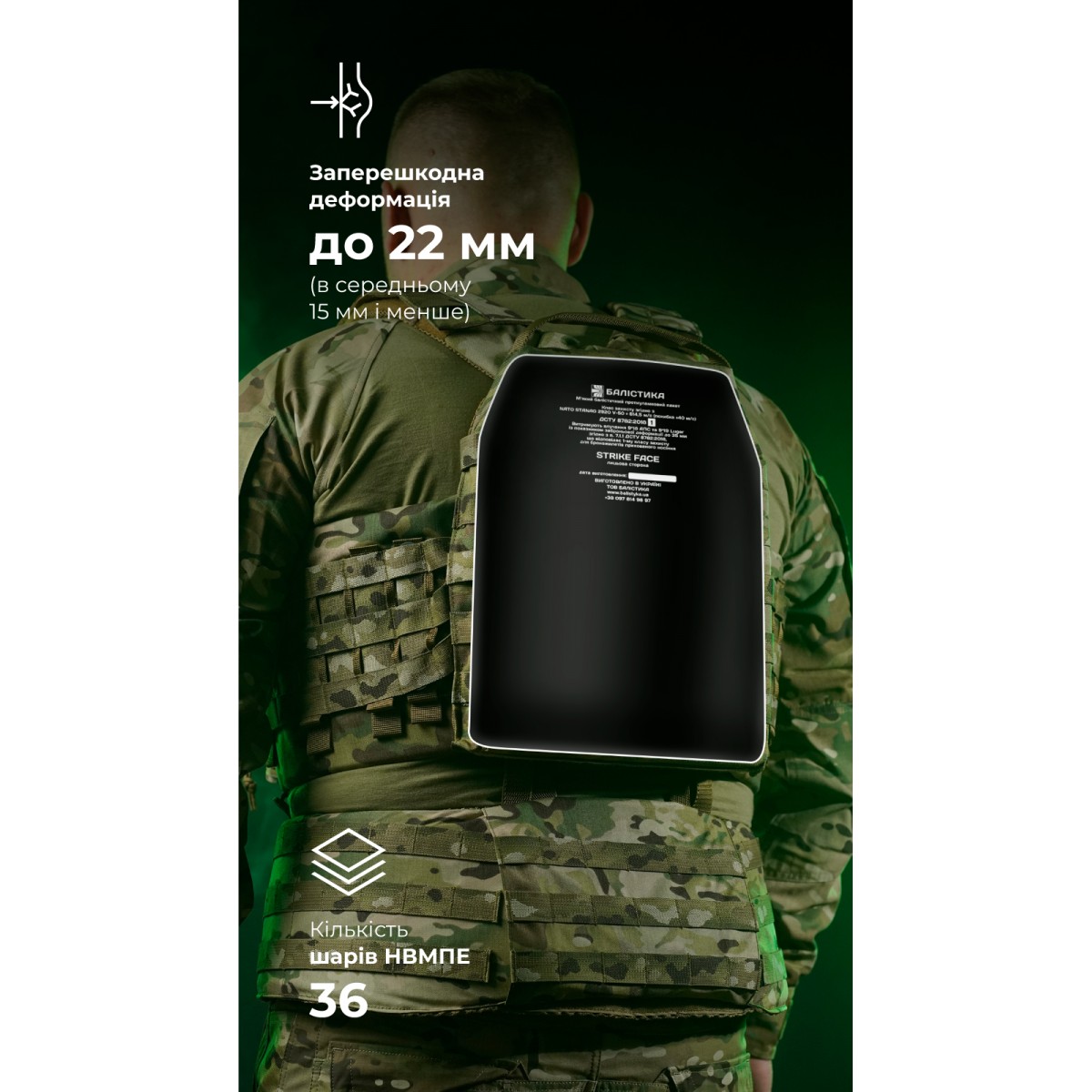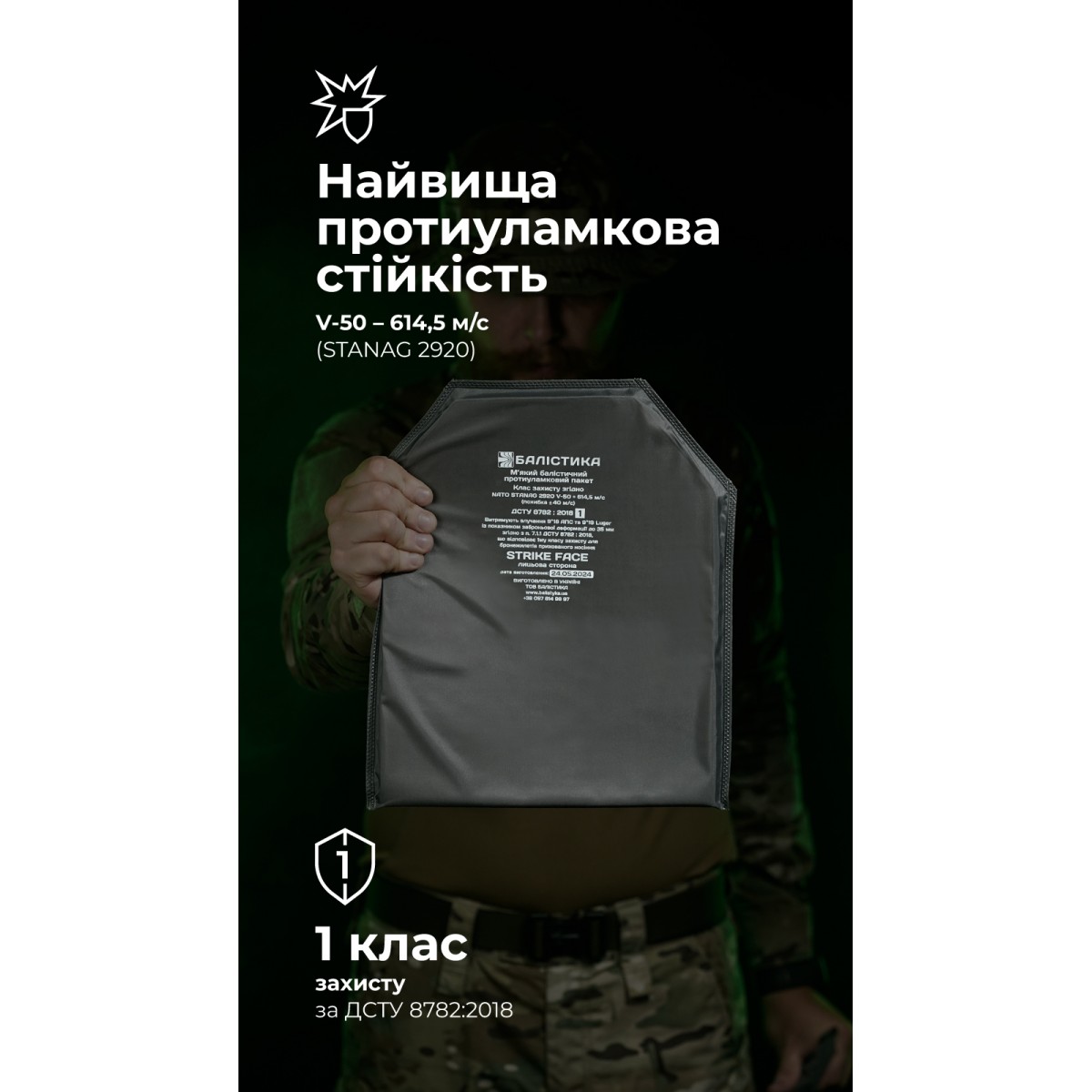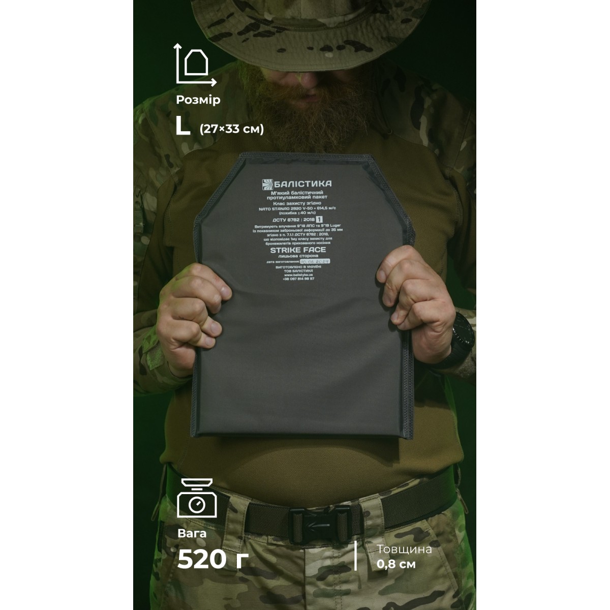 Мягкий баллистический подпор из СВМПЭ предназначен для защиты тела от осколков бронеплиты в случае ее пробития. Также уменьшает запреградную травму в ситуации, когда плита не пробита. ✅ Ключевые преимущества Самые высокие показатели противоосколочной стойкости: бронепакет из 36 слоев СВМПЭ держит осколки со скоростью 614,5 м/с (STANAG 2920 V50) Сырье мирового уровня: СВМПЭ от FMS (Израиль) Уменьшает запреградную травму: СВМПЭ от FMS имеет плотное перекрестное наложение волокон, что уменьшает вдавливание брони с внутренней стороны Соответствует 1-му классу защиты по ДСТУ 8782:2018 Запаян в герметичный чехол, который защищает от влаги, грязи и ультрафиолета Описание товара Наши бронепакеты созданы прежде всего для защиты от осколков, которые являются наиболее распространенной угрозой на фронте. Изделия имеют самые высокие показатели противоосколочной стойкости и результаты по показателю V50 (STANAG 2920, ДСТУ 8782:2018) в своем классе. Сверхвысокомолекулярный полиэтилен (СВМПЭ), из которого они изготовлены, является легким, гибким и одновременно очень прочным материалом. Основная задача баллистического подпора из сверхвысокомолекулярного полиэтилена – «подстраховать» плиту формата SA (Stand Alone) от пробоя. А если это формат ICW (In Conjunction With), то использование подпора вообще обязательно. Подпор устойчив к поражению пулями калибра 9×18 мм (9 mm Makarov), 9×19 мм (9 mm Luger, 9 мм Parabellum), 9×19 (мм), что соответствует 1-му классу защиты по ДСТУ 8782:2018. Во время испытаний выдерживает выстрел из автоматического пистолета Стечкина с расстояния 5 м. ℹ️ Протокол отстрела бронепакета 1-го класса защиты согласно ДСТУ (STANAG V50 – 614,5 м/с) ℹ️ Протокол отстрела бронепакета 1-го класса защиты согласно ДСТУ (8782:2018 ) Защищает от мелких осколков и вторичных поражающих элементов – фрагментов бетона, кирпича, стекла, дерева и т. д. Имеет запреградную деформацию до 22 мм (в среднем 15 мм и меньше). Этому способствует плотное плетение волокон СВМПЭ. Это критически важно для снижения риска контузий без пробития. Улучшает защитные свойства бронеплиты. Но повышение класса не является прямым, то есть если к плите 3-го класса защиты добавить мягкий баллистический подпор 1-го класса защиты, в сумме это не даст 4-й класс защиты. Ультразвуковая герметизация гарантирует, что бронепакет не потеряет свойства под влиянием пота, дождя, грязи или прямых солнечных лучей. Продуманное количество слоев и естественная гибкость материала способствуют тому, что бронепакет адаптируется к форме тела и не мешает в бою. ℹ️ Подпоры из СВМПЭ актуальны для любых бронеплит, ведь могут остановить их фрагментированные осколки. К примеру, они показали эффективность во время тестового отстрела стальной бронеплиты 4-го класса защиты. Для этого была использована пуля Б32 для боеприпаса калибра 7,62×54 и БЗ для калибра 7,62×39, которые пробивают четвертый класс. И хотя оказалось, что плита пробита, но осколки пули и самой плиты остановились в подпоре из СВМПЭ. Опытный манекен получил сильный удар, но благодаря демпферу остался «живым». ❓ Часто задаваемые вопросы Нужен ли подпор к металлической плите? Да, если вы хотите повысить свою безопасность. Во время пробития осколки бронеплиты могут представлять реальную угрозу жизни и здоровью воина. Подпор способен остановить их и уменьшить последствия травмы. Можно ли дальше использовать баллистичес