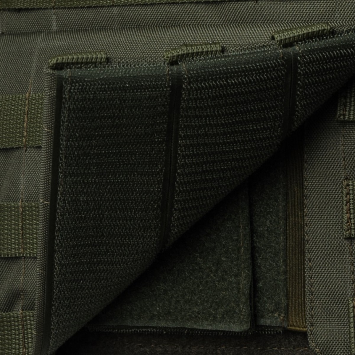 Грудной секции с внутренним карманом для установки мягкого баллистического пакета или бронеплиты размером 25х30 см. Сверху расположена панель Velcro, снизу - три ряда петель Molle;