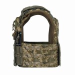 Тактический жилет – плитоноска может нести баллистические пластины стандартного размера 250Х300, которые качественно крепятся двойной фиксацией. Весь жилет оклеен лентами в камуфляжной системе MOLLE, что допускает любую конфигурацию (итоги под магазины, аптечку, сумку сброса и т.д.). На плечиках есть «подъемники», позволяющие позиционировать и фиксировать баллистические пластины по высоте. Боковины надежно держатся на липучках и имеют возможность вставки бокового баллистического пакета. Благодаря простой конструкции, основанной на шести элементах - передней панели, задней панели, 2-х поясах, 2-х комфортных плечиках и используемой быстросъемной фурнитуре, у пользователя есть возможность быстрого сброса жилета за 1 сек. Внутренняя часть жилета выполнена дистанционной сеткой, что увеличивает комфорт при ношении.