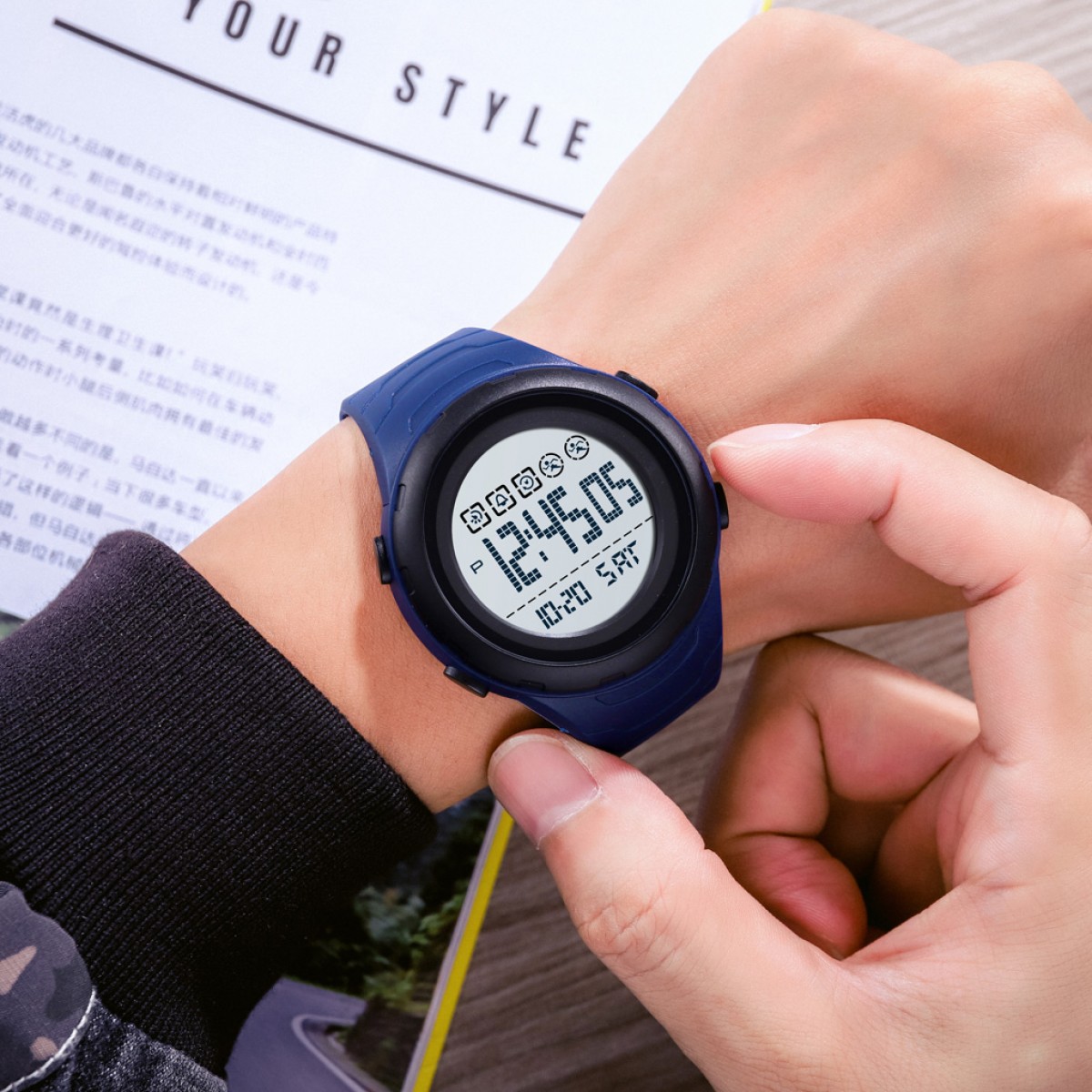 Его размеры составляют 46 х 48 мм, а длина ремешка – 24,5 см, ширина – 22 см. Помимо основной функции отображения времени, Skmei 1674BUWT оборудован будильником, календарем, вторым часовым поясом и секундомером. Подсветка реализована с помощью электролюминесцентной технологии, позволяющей удобно пользоваться часами в темноте. Эти мужские часы в черном корпусе и синем ремешке станут отличным дополнением к вашему спортивному и casual стилю. Часы имеют гарантию 12 месяцев и изготовлены в Китае. Вес устройства – 52 г.