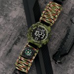 Корпус изготовлен из прочного полиуретана, а ремешок из паракорда обеспечивает комфорт и долговечность. Часы оснащены электронным механизмом и функциями будильника, календаря, секундомера и второго часового пояса.