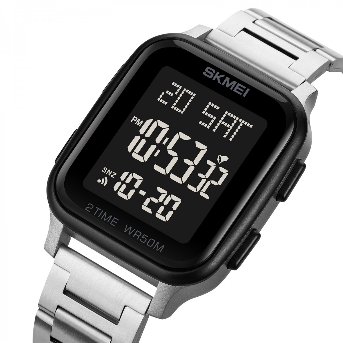 Подчеркните свой стиль с часами Skmei 1859SI! Эти элегантные спортивные часы имеют прямоугольную форму корпуса, изготовленного из прочного полимера и украшенного серебристым браслетом из нержавеющей стали. Его современный электронный циферблат оснащен арабскими цифрами для легкого считывания времени, а также предоставляет дополнительные функции, такие как будильник, календарь, секундомер и второй часовой пояс.