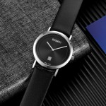 Корпус из металла серебристого цвета имеет диаметр 38 мм и толщину 8 мм, а черный кожаный ремешок обеспечивает комфорт во время ношения.