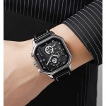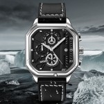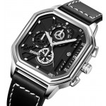 Часы комплектуются кожаным черным ремешком, что обеспечивает комфорт и элегантный вид. Оснащенный кварцевым механизмом, он имеет стрелочный циферблат с индексацией часов, минут, секунд и числа, а также функции календаря и секундомера.
