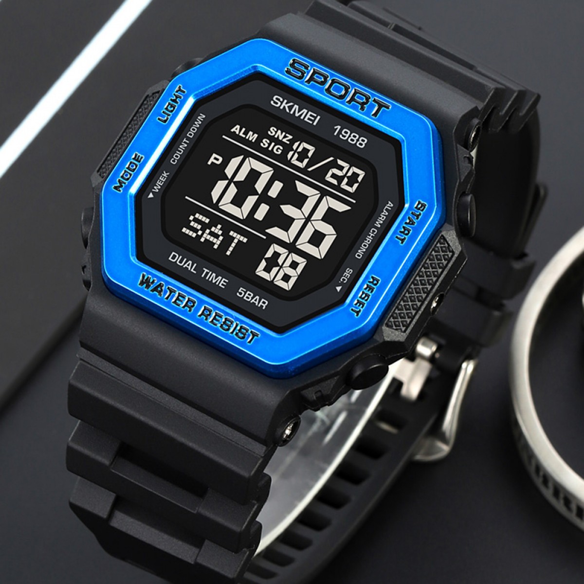 Часы оснащены различными функциями, включая будильник, календарь, секундомер и второй часовой пояс, что делает его универсальным помощником в повседневной жизни. Черный ремешок из каучука и квадратный корпус в черном и синем цветах придают ему стильный вид.