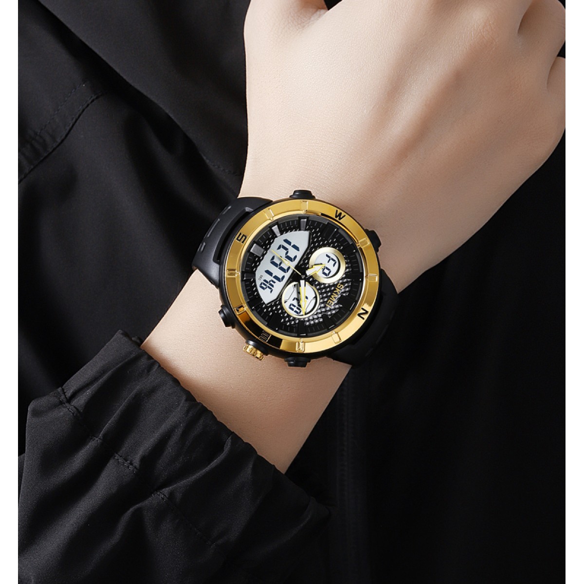 Часы Skmei 2014GDWT Gold-White – это стильный спортивный аксессуар для современного мужчины. Модель обладает водонепроницаемостью до 50 метров, что делает ее идеальной для активного образа жизни. Корпус изготовлен из полимера в золотистом цвете, а ремешок из прочного полиуретана черного цвета. Круглая форма корпуса содержит стрелочно-электронный циферблат, оснащенный электролюминесцентной подсветкой. Часы оборудованы функциями будильника, календаря, второго часового пояса и секундомера. Гарантия на продукт составляет 12 месяцев. Размеры часов: 50 х 50 мм, вес – 61 г, ширина ремешка – 24 мм, длина – 25 см. Бренд: Skmei. Страна производителя: Китай.