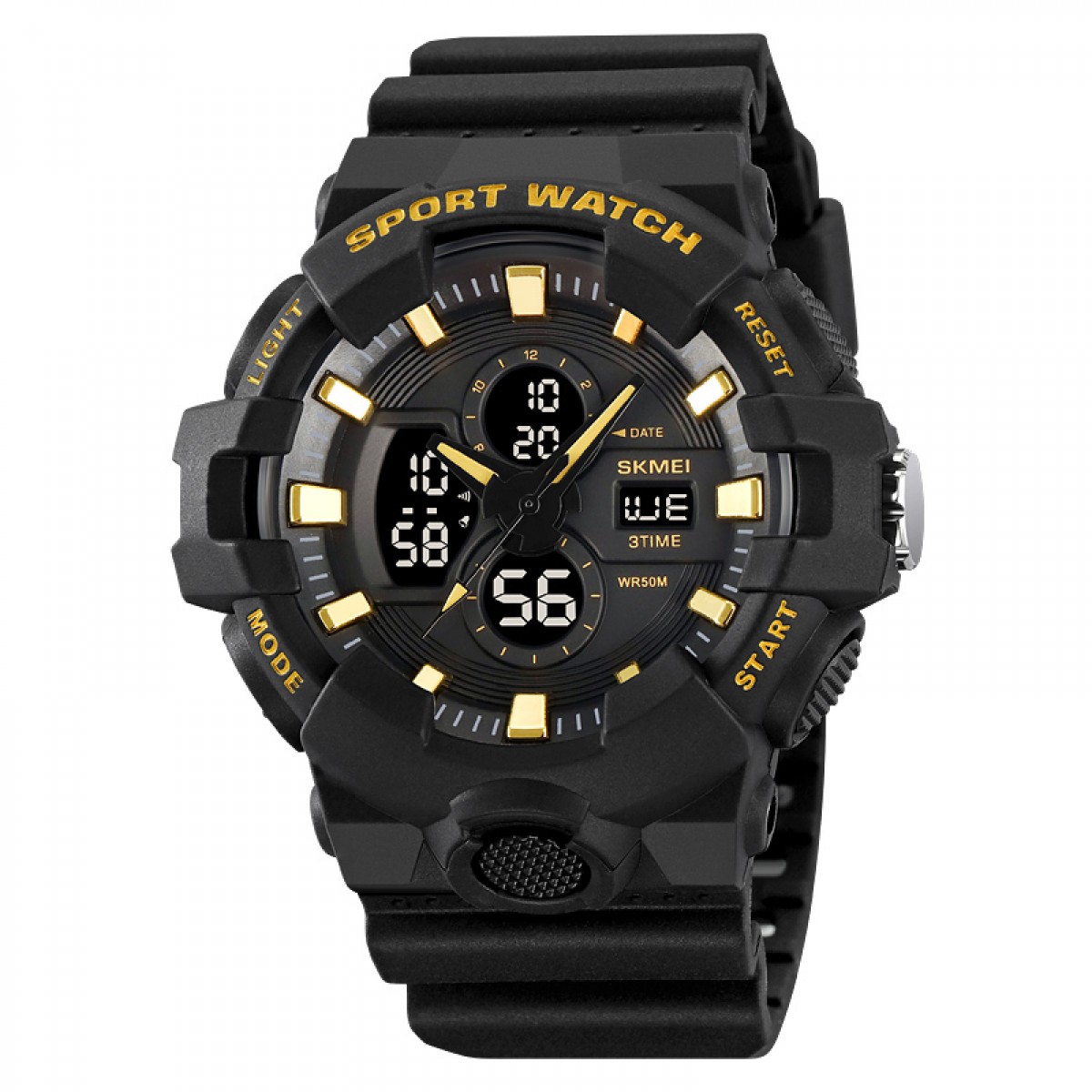 Skmei 2117BKGD Black-Gold – это стильные мужские часы с функциональным дизайном. Водонепроницаемость до 50 м делает их идеальными для активного образа жизни. Корпус изготовлен из полимера, а ремешок – из крепкого каучука, что обеспечивает комфорт во время ношения. Часы имеют круглую форму корпуса и электронный механизм, объединяющий стрелочный и электронный циферблат.