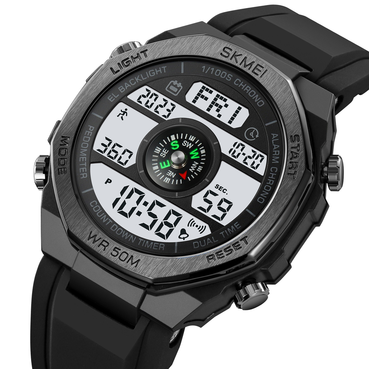 Эти часы оборудованы множеством полезных функций, таких как будильник, календарь, секундомер, компас и второй часовой пояс. Электролюминесцентная подсветка и четкая индикация (часы, минуты, секунды, день недели, месяц, число) обеспечивают отличную видимость в любое время суток.