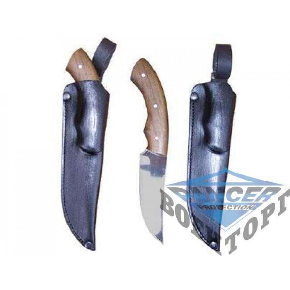 Ножны изготавливаются из ременной кожи толщиной 3,0-3,5 мм. Крепятся на подвеске к поясу шириной до 5 см. Используются для ношения ножа с клинком размером 130х40 мм. Длина рукоятки 140 мм.