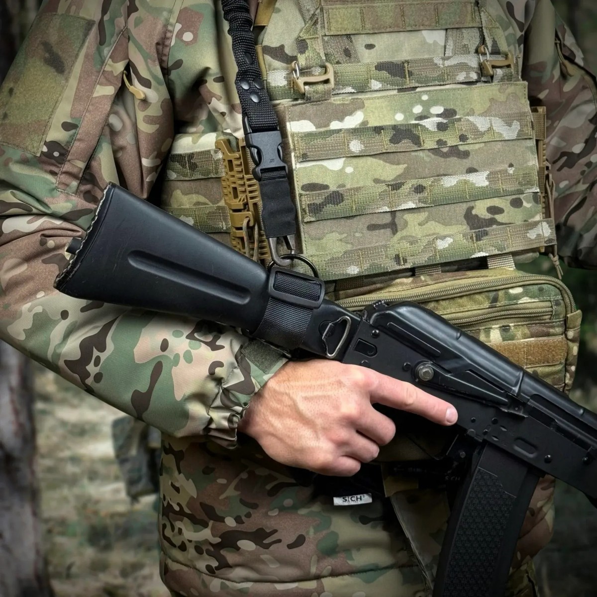 Дополнительное крепление с металлическим полукольцом на сужение приклада заменит Вам антабку при ее отсутствии, или если она расположена на краю приклада, что неудобно при использовании одноточечных оружейных ремней.