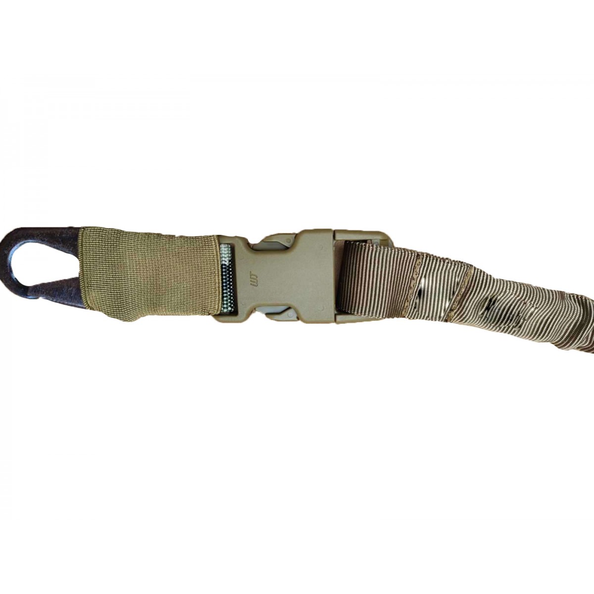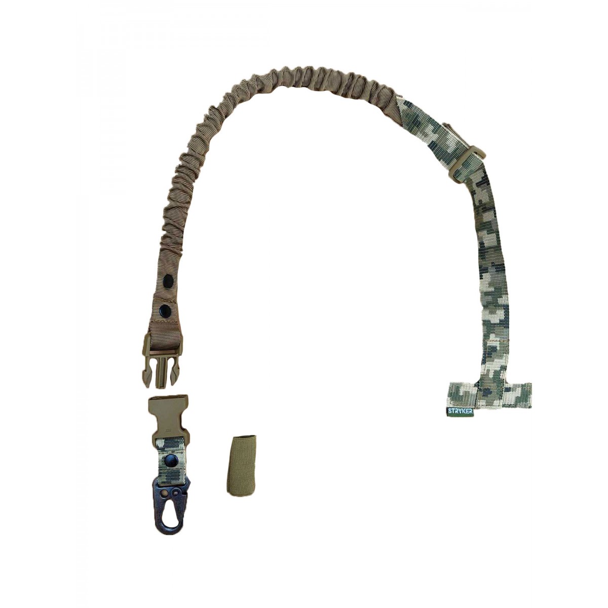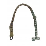 Карабин изготовлен из прочной стали US Mil. Спец. ИК-материалы. Это полностью регулируемая одноточечная стропа для банджи, которая крепится через Т-образный стержень к любому MOLLE-совместимому жилету, нагруднику или броне. Позволяет работать обеими руками, предотвращая натирание шеи, которое иногда наблюдаются при использовании других строп. Прикреплен к крючку в стиле H&K, для быстрого отсоединения от оружия.