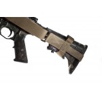 С тыльной стороны крепится за приклад (обжимной крепеж), а спереди с помощью петли.