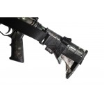 С тыльной стороны крепится за приклад (обжимной крепеж), а спереди с помощью петли.