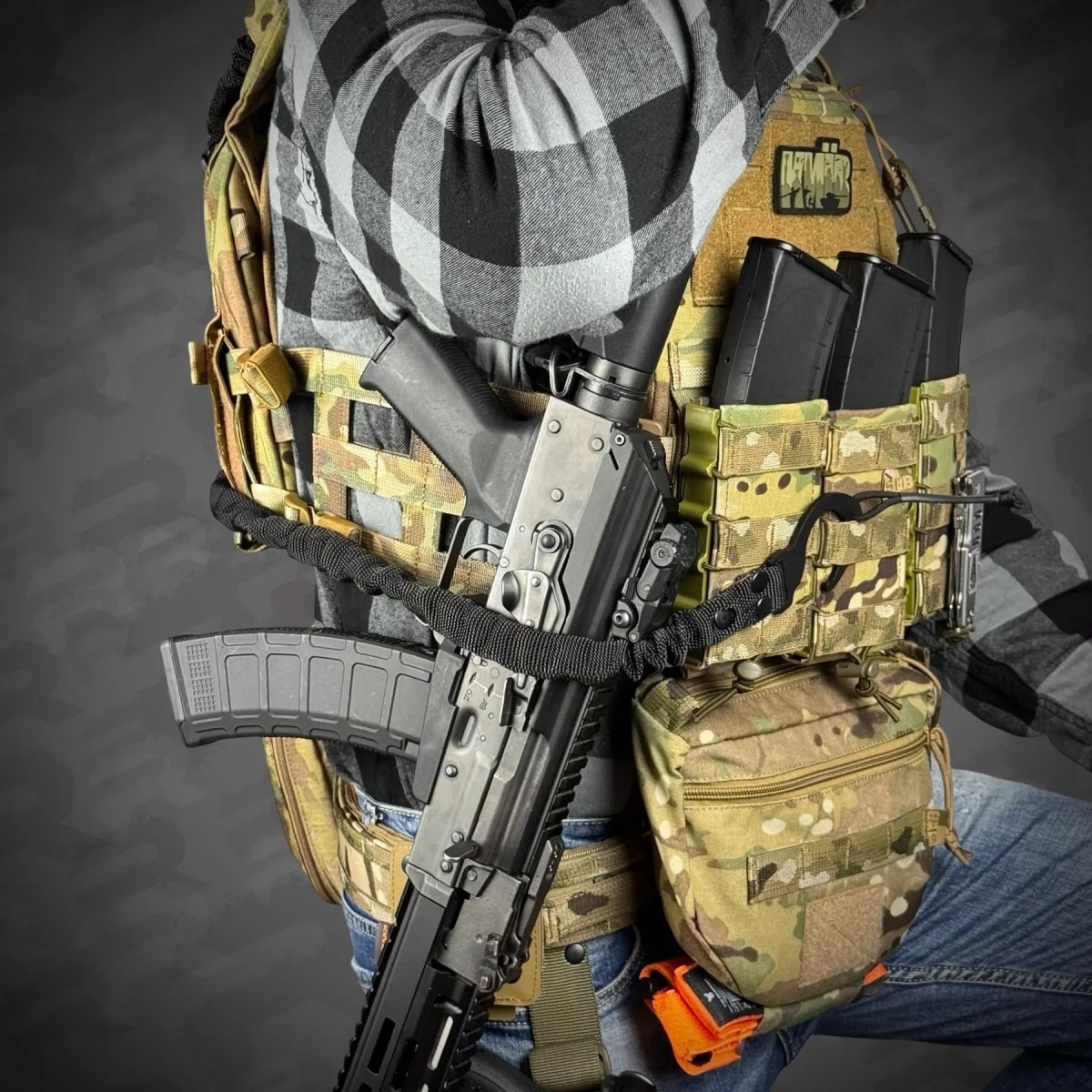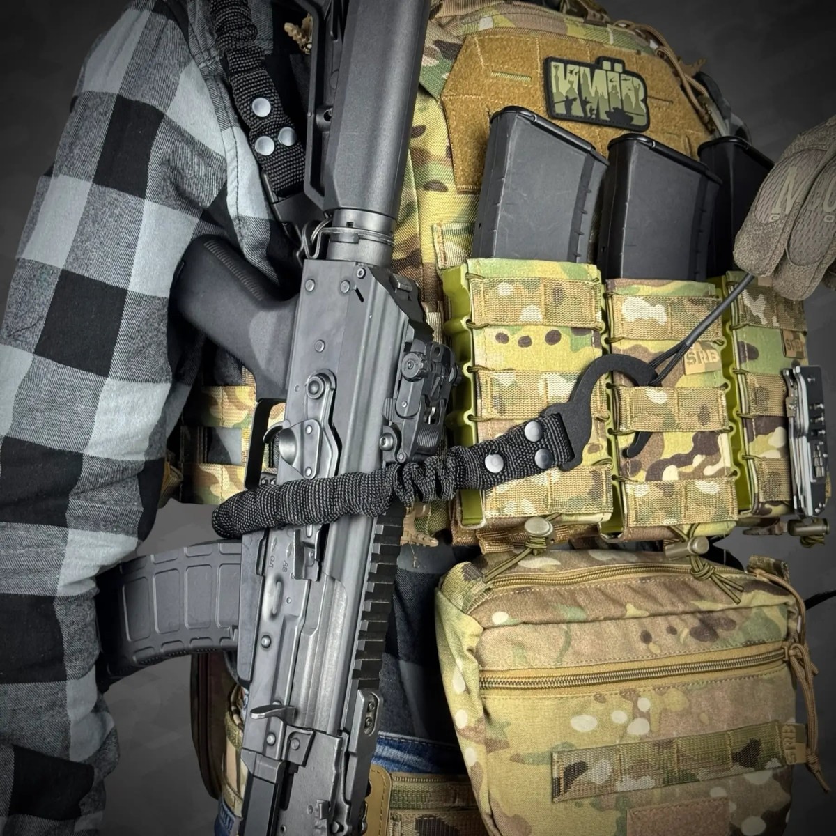 Система банджи позволяет регулировать уровень натяжения ремня в зависимости от ситуации. Она обеспечивает свободу движений и быстрый доступ к оружию при необходимости.