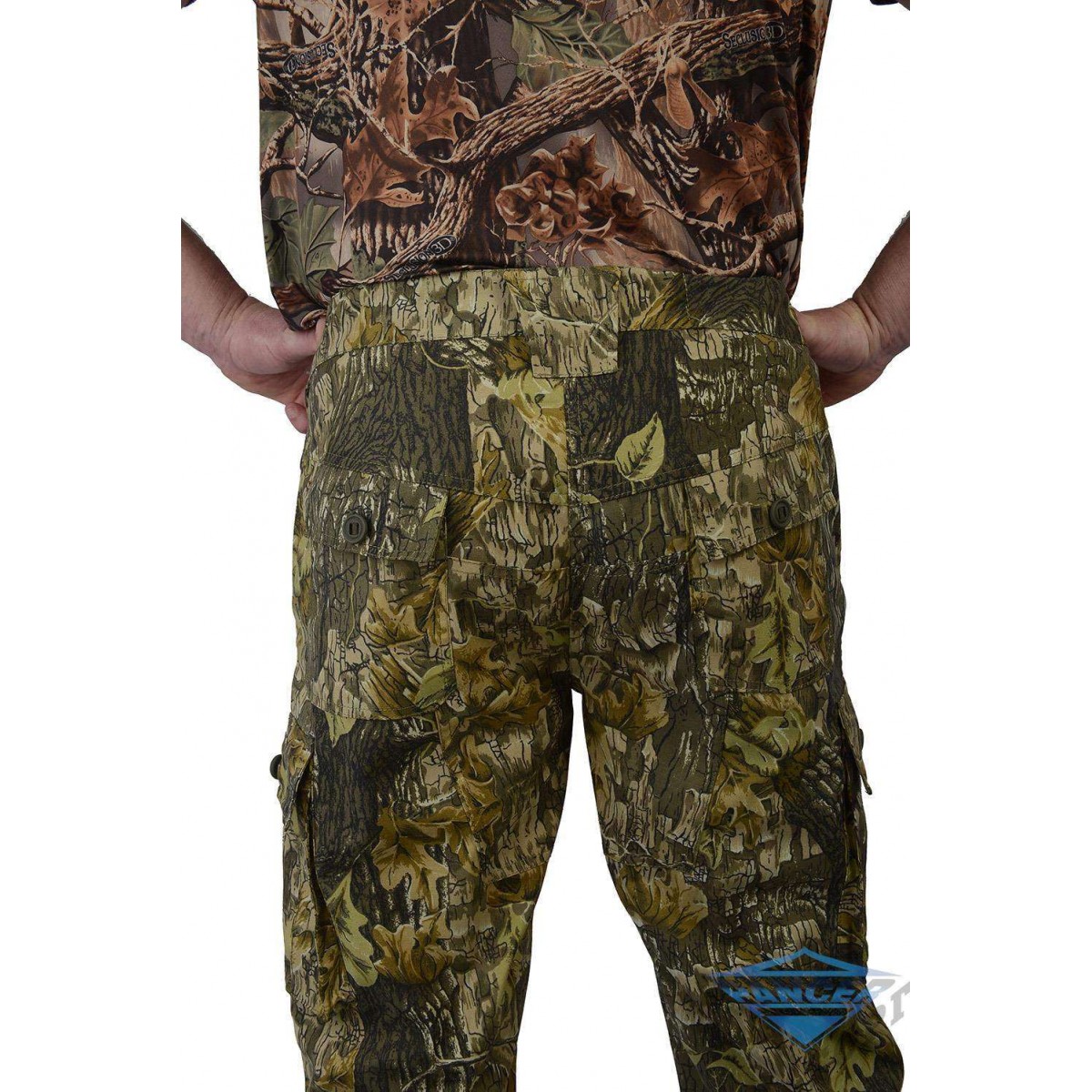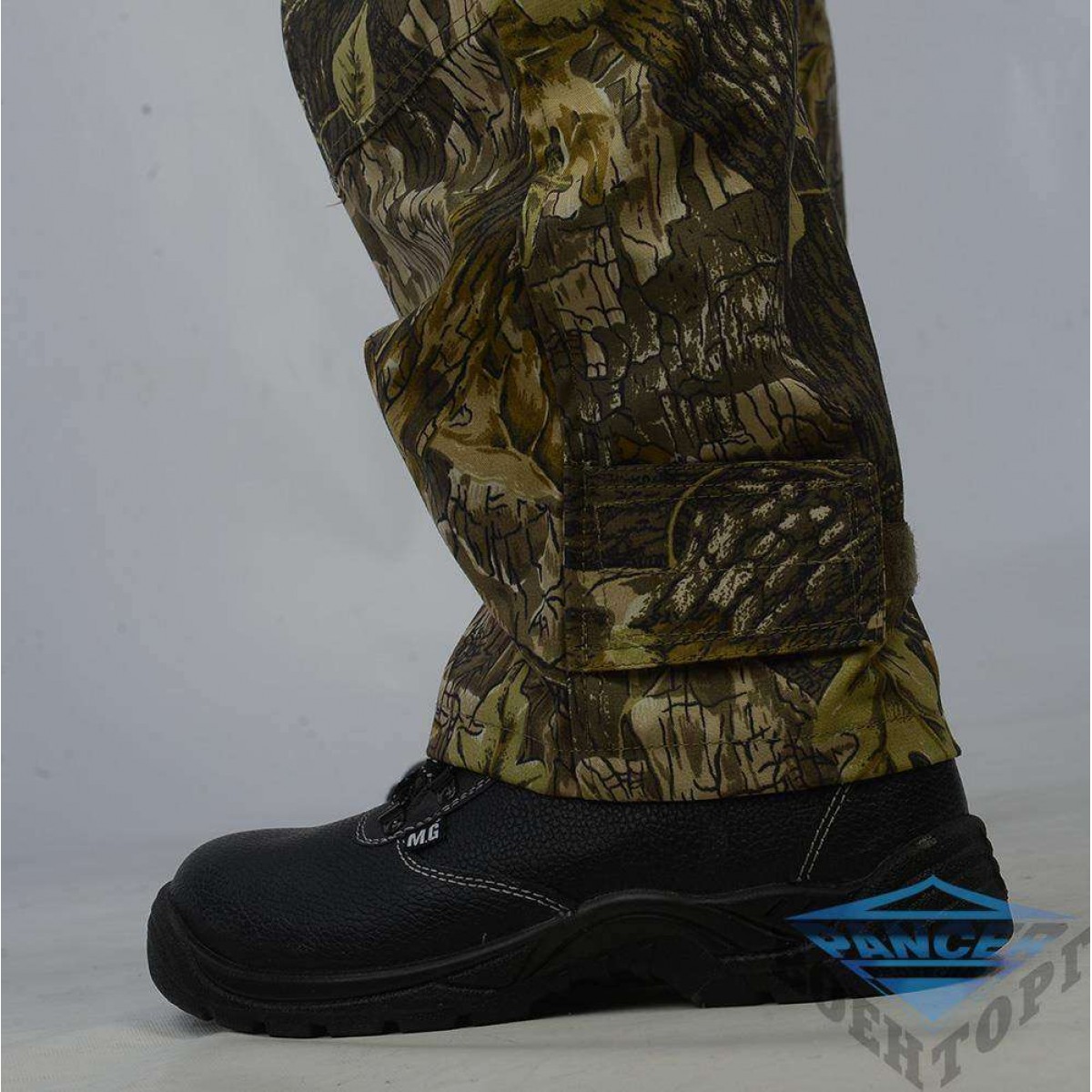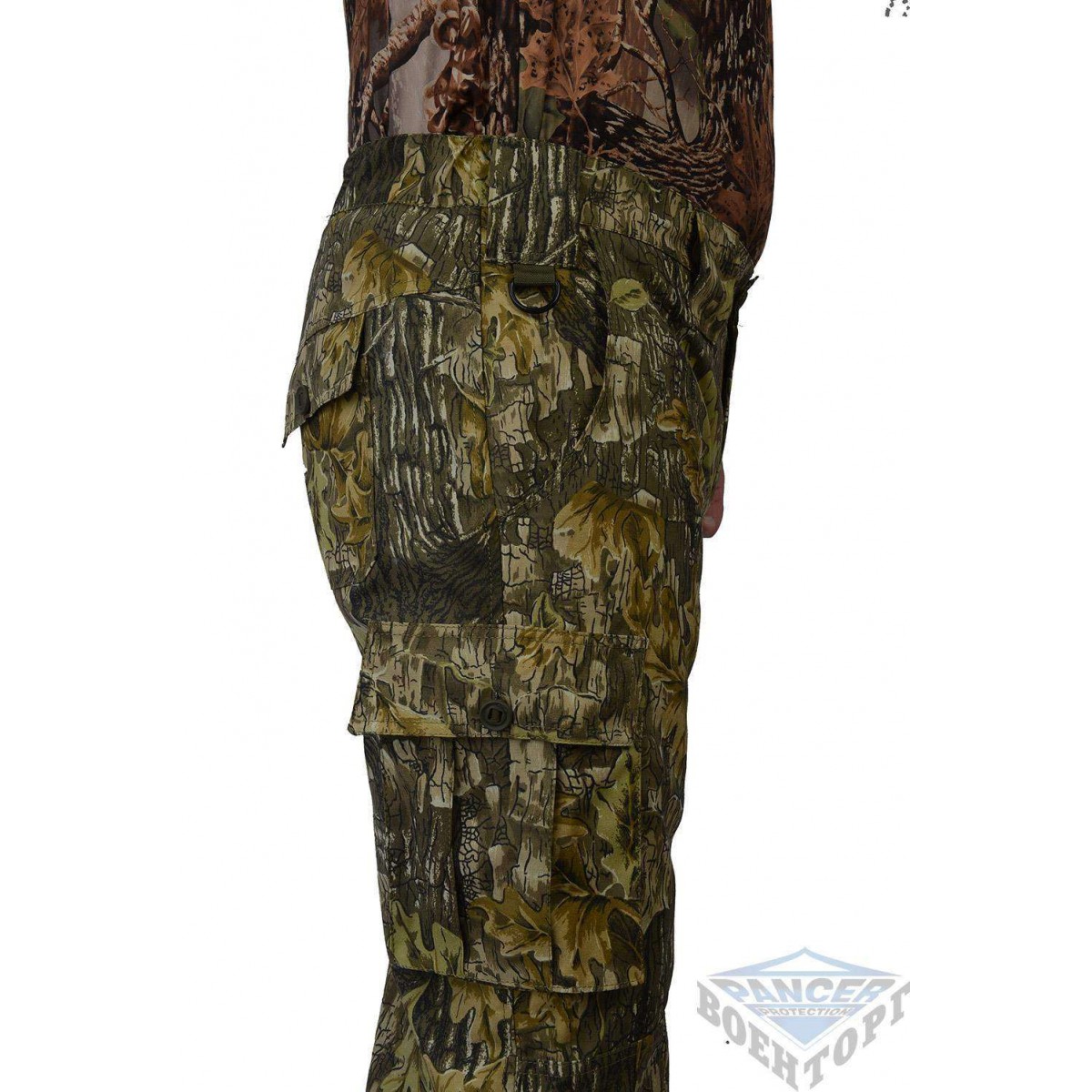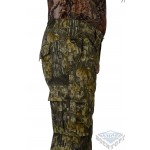 Брюки свободного покроя. Колени и задняя часть усилены дополнительным слоем ткани. В пояс вшита резинка для более плотного прилегания. Поясные шлёвки 6 см. На брюках размещены шесть карманов: два передних типа аристократ», два задних и два объёмных боковых застёгивающиеся на защитный клапан английской пуговицей». Спереди над карманами вшиты два полукольца, для крепления карабинов. Низ брюк стягивается при помощи велкро.