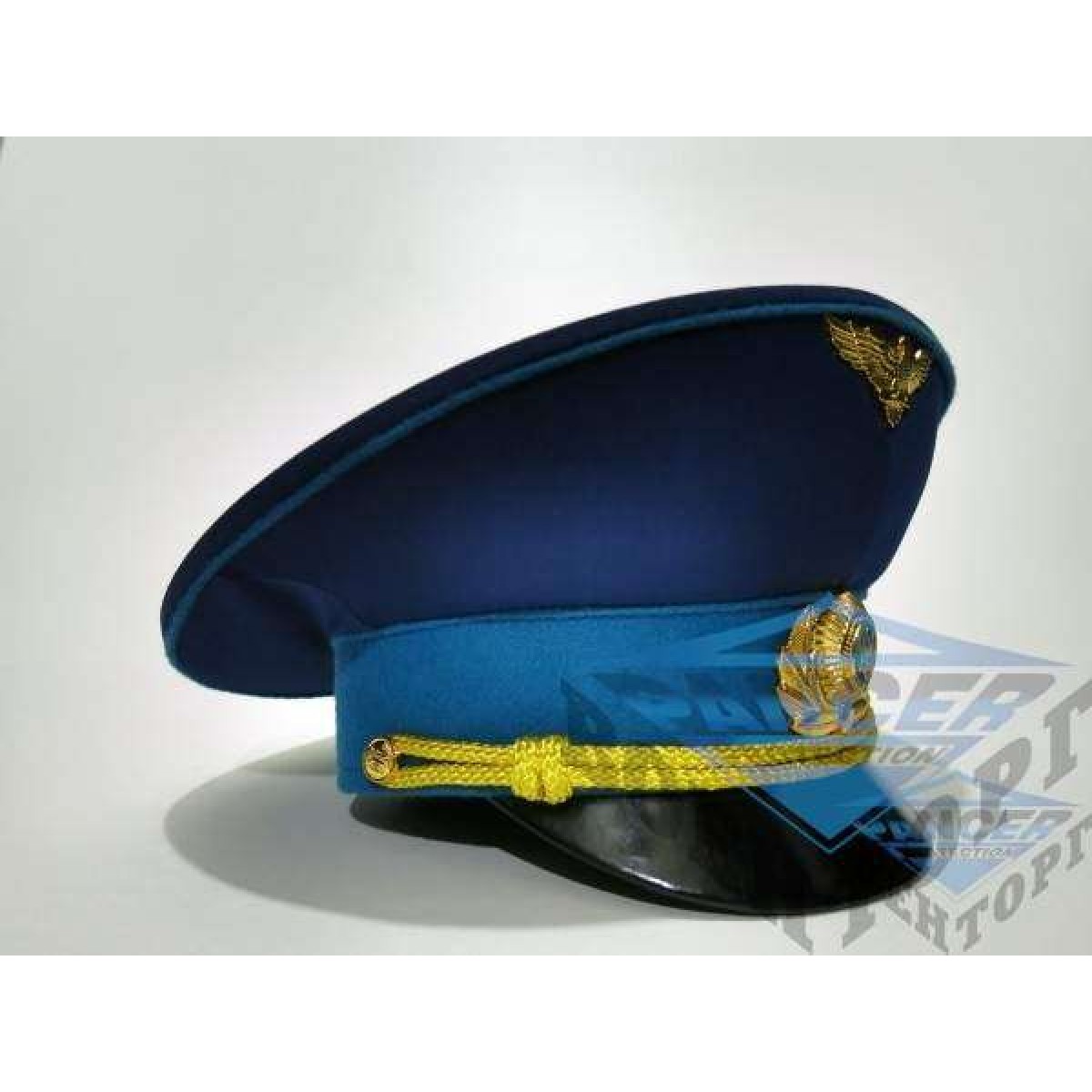 Ткань: габардин Основной цвет: синий Цвет околыша: голубой Цвет канта: голубой Кокарда: пластиковая, 2 шт. (верхняя и нижняя) Позумент (галун): филигранный шнур (желтый)