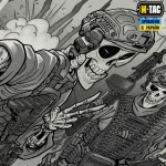 Основой для принта стало фото 3-х друзей военных, сделанное на поллароид. На изуродованной военными действиями фотографии, запечатлелось не только мгновение ожесточенного боя, но и внутреннее состояние наших усталых, но несгибаемых воинов. Которые на грани собственных сил, несмотря на огромную усталость, продолжают вести борьбу с врагом.