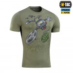 По команде оператора, дрон запускает гранату в направлении враждебной цели, чтобы задвухсотить противника. Как результат, видим горящую технику и "наевшихся и спящих" зеленых человечков. Сзади футболки также небольшой принт в патриотических желто-голубых цветах с изображением ручной осколочной гранаты Ф1. Из-за своей характерной формы и яйцевидного ребристого металлического корпуса, военные называют ее «Лимонкой».