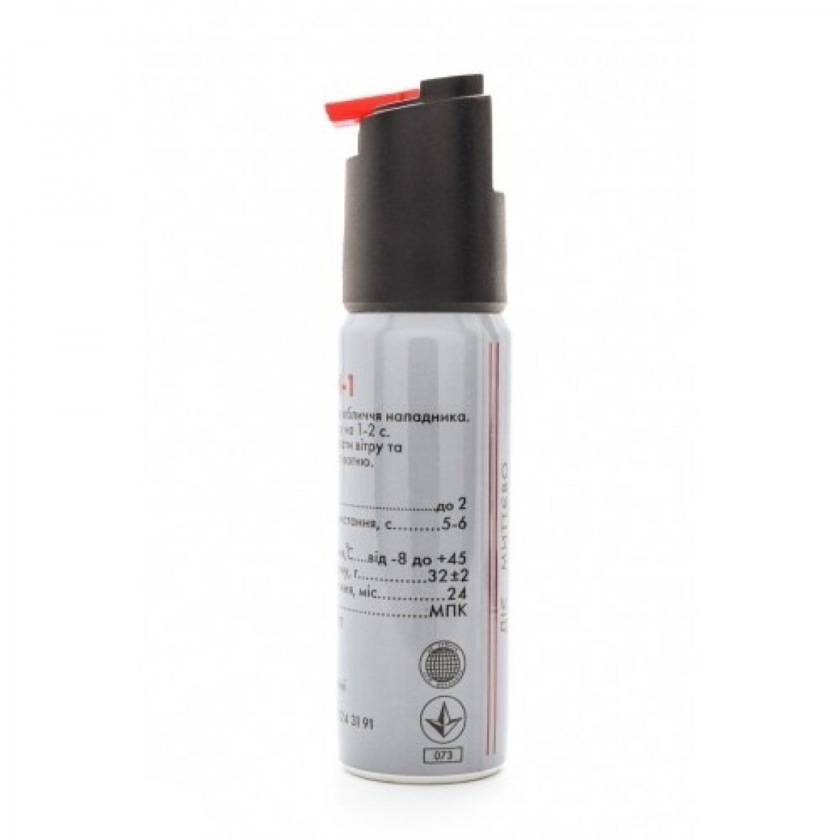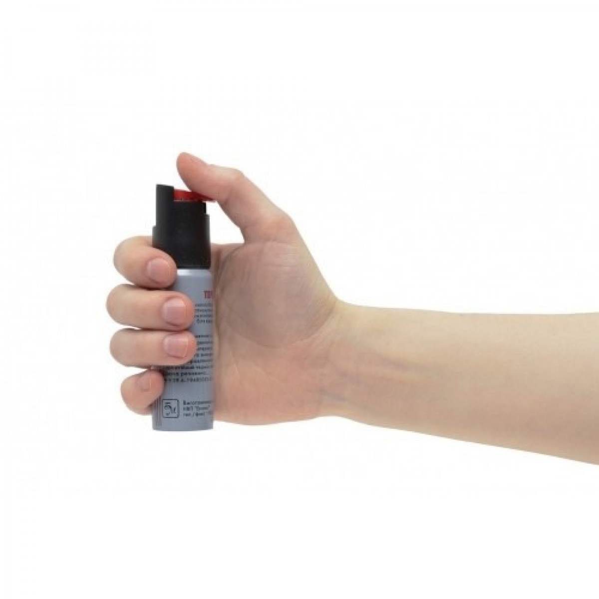 Применение. При возникновении опасности нападения максимально быстро достать баллон, удалить предохранительную пластину (большой палец руки должен остаться сверху на красной кнопке), направить сопло баллона в лицо нападающего и нажать на кнопку. При возможности необходимо учитывать направление ветра - при сильном встречном ветре можно самому быть пораженным веществом, хотя и в меньшей степени. Необходимо принимать во внимание то, что действие вещества недолговременно, так как зависит от многих факторов - насколько правильно применено изделие, насколько индивидуально восприимчив нападающий к таким веществам и др. Максимальная эффективность применения баллонов "Терен-1м" достигается на расстоянии до 2 м.