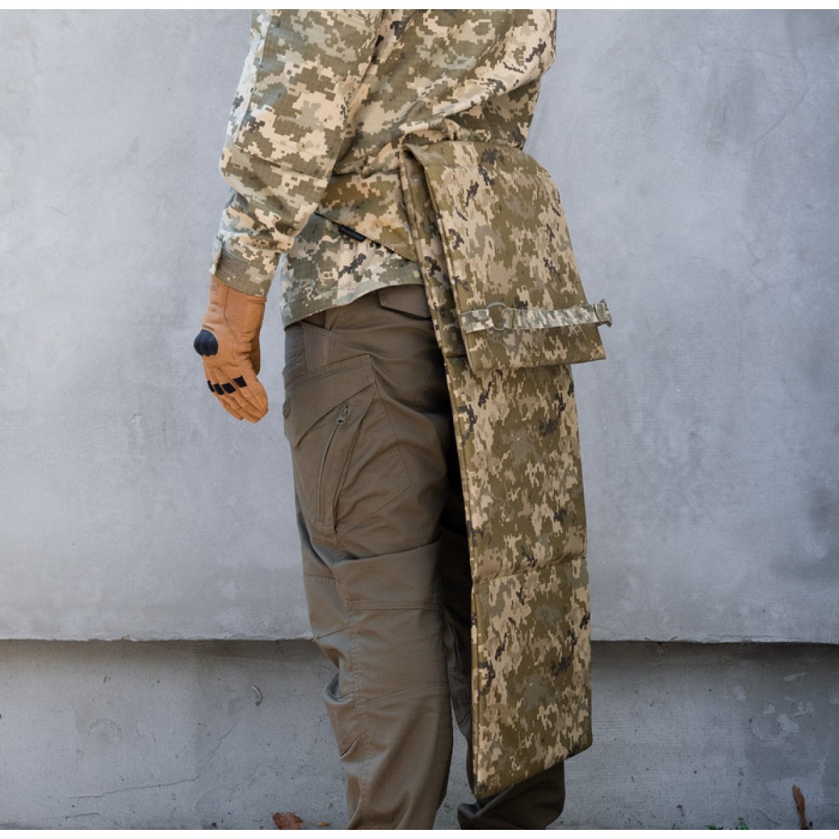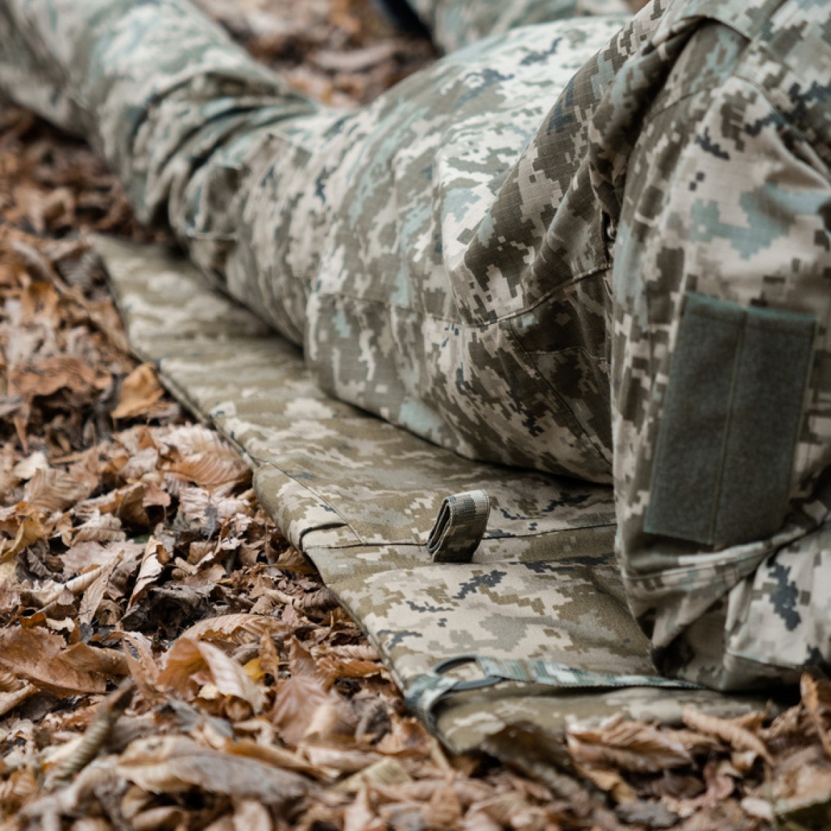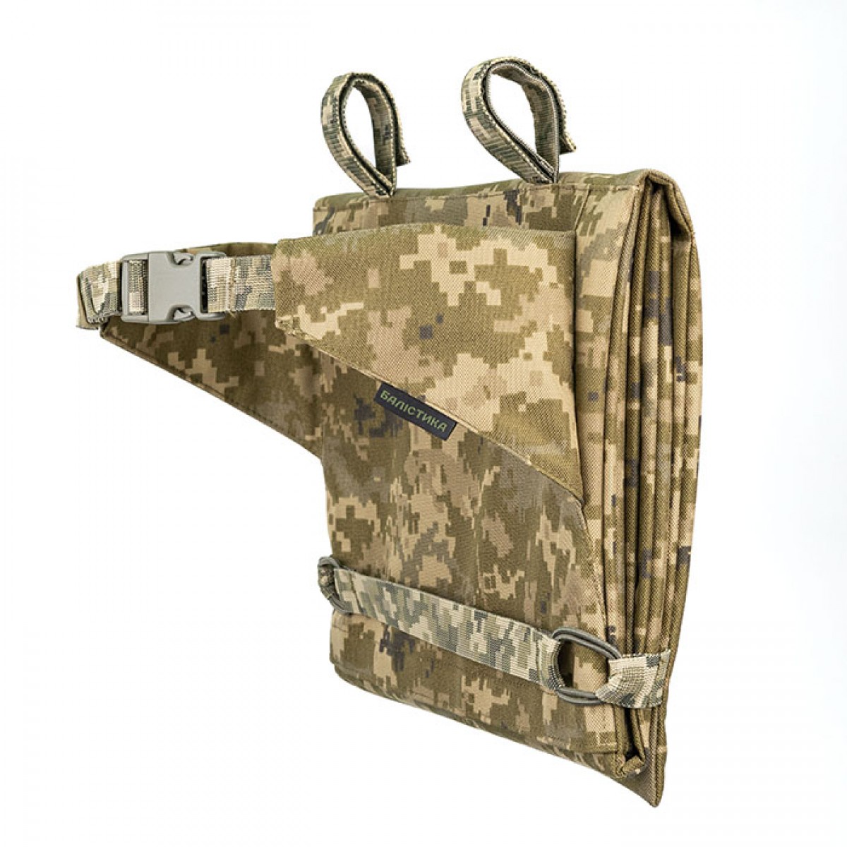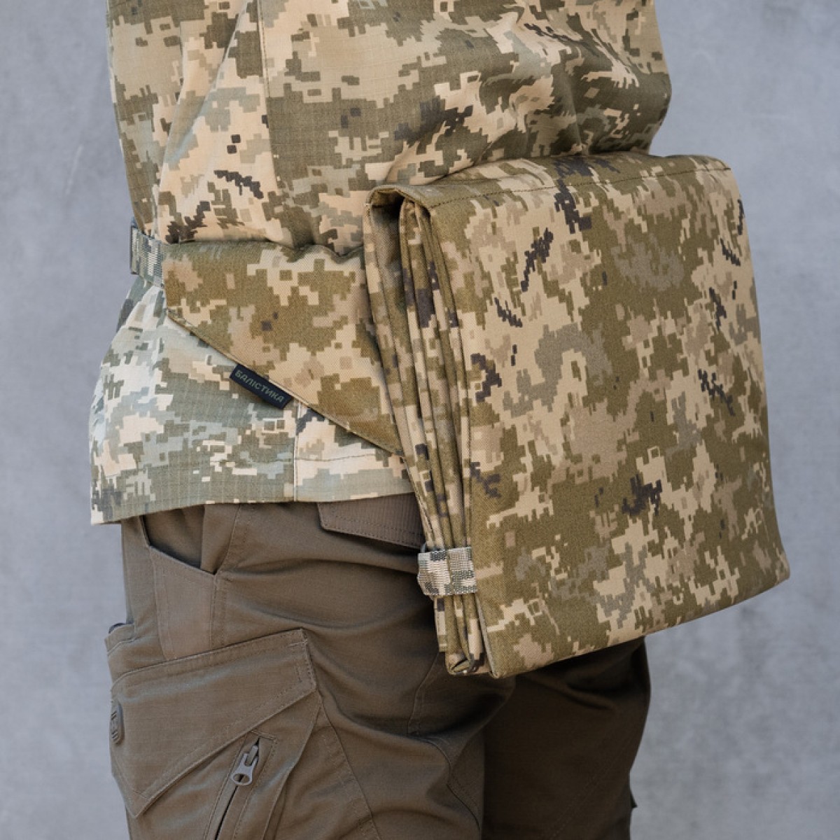 Раскладной коврик от компании «Баллистика» станет полезным дополнением к вашему снаряжению. Он предназначен для сидения на холодных, твердых, грязных поверхностях. Он легкий, простой и надежный. При этом позволяет не только сесть, но и лечь во время работы. Кроме того, в него можно установить нашу баллистическую защиту и в сложенном состоянии он защитит ягодицы и бедра от осколков. Особенности товара Коврик выполнен из качественного износо- и влагостойкого материала. Ткань эффективно противостоит влаге, грязи и механическим повреждениям, что делает ее пригодной для использования и на влажной почве, и на холодном камне или металле. К другим свойствам коврика относятся следующие: Сформирован из четырех отсеков, разделенных швами, благодаря чему его удобно складывать книжечкой. После складывания коврик можно закрепить при помощи перекидной стропы с эластичными шнурками, чтобы он не раскрывался и не болтался. В каждом отделе содержится слой упругой пенки, который добавляет удобства при сидении на твердых поверхностях. Есть возможность использовать бронепакет 35×25,5 см. Для этого в одном из отсеков есть отверстие на липучке, через которое слой пены извлекается и устанавливается бронепакет. Купить мягкую баллистическую противоосколочную защиту можно отдельно, в комплект она не входит. Сложенный коврик не занимает много места и служит отличной сидушкой. В разложенном состоянии достаточно большой, чтобы можно было прилечь, хоть и не в полный рост, и достаточно простой, чтобы быстро его собрать. Можно вешать на пояс с помощью боковых лямок. Они выполнены в виде крылышек и пришиты к коврику под углом. Внутри них расположена эластичная лента, которая снаружи продолжена обычной стропой. Благодаря этому во время сидения, лежания или активности крепление не пережимает кожу и позволяет свободно двигаться. Стропы соединяются фастексом и имеют достаточно запаса для регулировки по длине (91 см). Свободный конец фиксируется резинкой. Также можно пришнуровать на систему MOLLE, например к РПС, или подвесить на обычный ремень. Для этого используются два крепления с петлями на велкро-липучке, которые можно отрегулировать по длине. Благодаря фастексам на них коврик можно быстро отсоединить или присоединить без необходимости возиться со шнуровкой. Технические характеристики Материал: Cordura 1000D. Стропа: полиамид, 2,5 см. Эластичная лента: 2,5 см. Шнурок: шоккорд, 3 мм. Липучка: Velcro. Фурнитура: фастекс (Ammolit Plus). Размеры в сложенном состоянии: 36×26×4,4 см. Размеры в разложенном состоянии: 36×112×1,1 см. Вес (без бронепакета): ~700 г.Основные характеристики Коврик тактический раскладной (ММ-14)