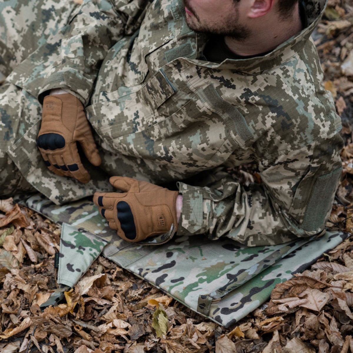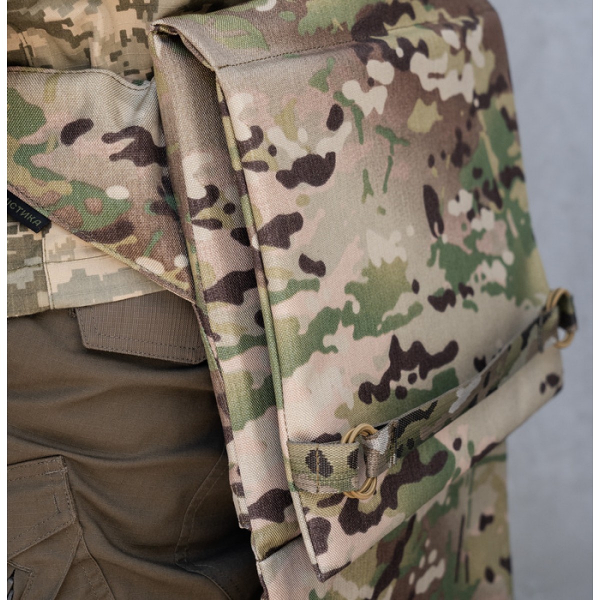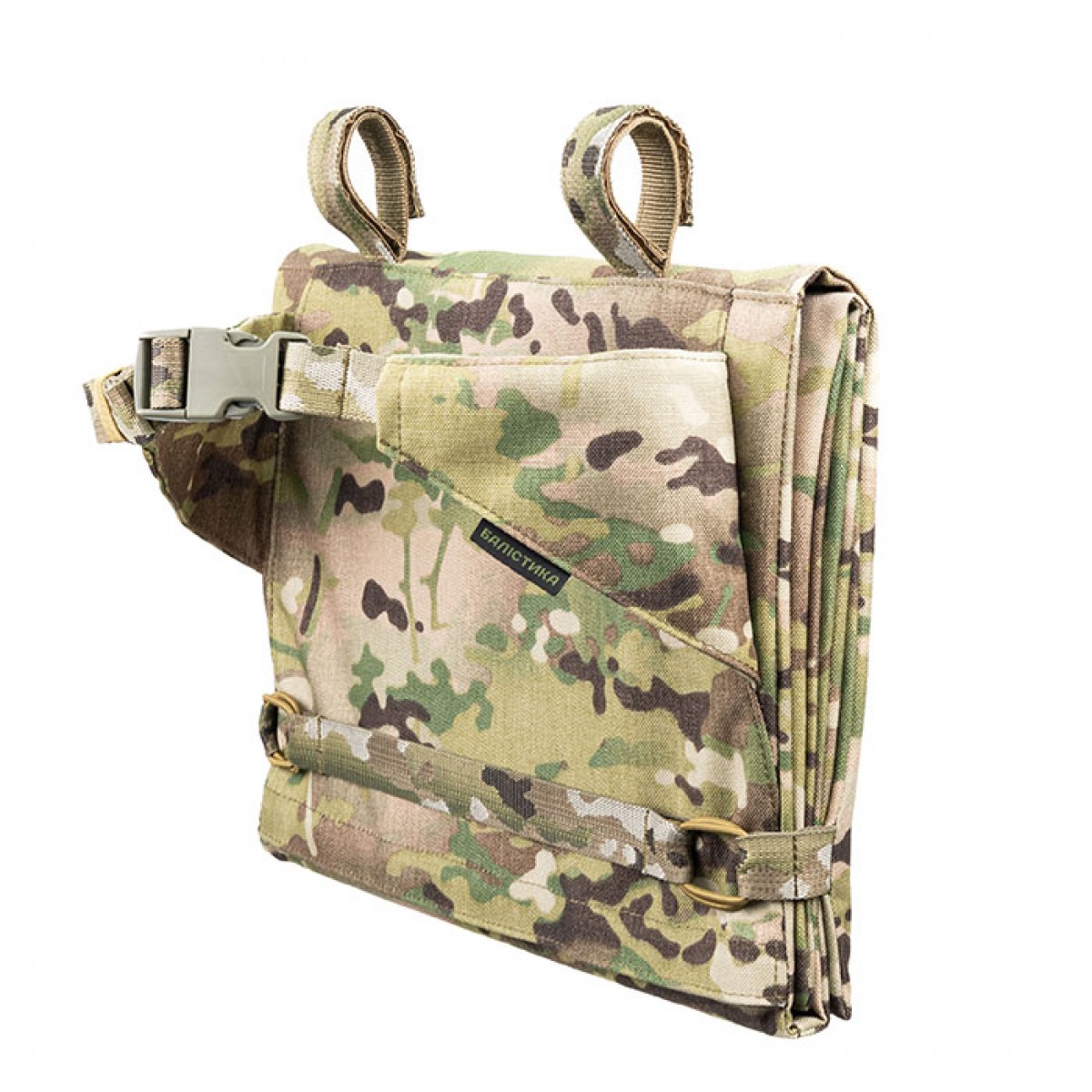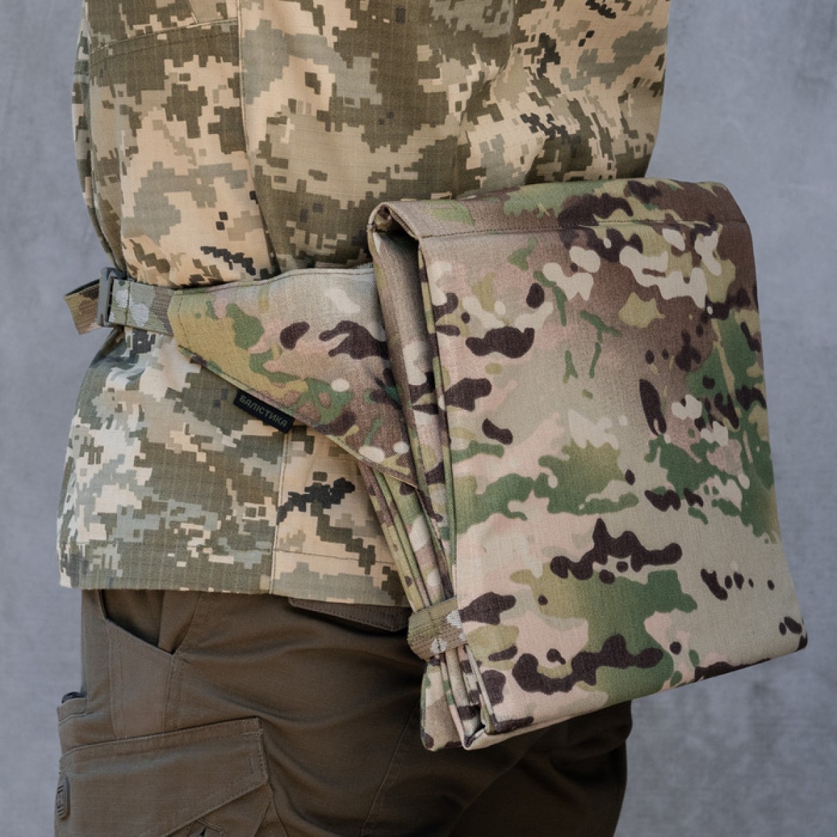 Раскладной коврик от компании «Баллистика» станет полезным дополнением к вашему снаряжению. Он предназначен для сидения на холодных, твердых, грязных поверхностях. Он легкий, простой и надежный. При этом позволяет не только сесть, но и лечь во время работы. Кроме того, в него можно установить нашу баллистическую защиту и в сложенном состоянии он защитит ягодицы и бедра от осколков. Особенности товара Коврик выполнен из качественного износо- и влагостойкого материала. Ткань эффективно противостоит влаге, грязи и механическим повреждениям, что делает ее пригодной для использования и на влажной почве, и на холодном камне или металле. К другим свойствам коврика относятся следующие: Сформирован из четырех отсеков, разделенных швами, благодаря чему его удобно складывать книжечкой. После складывания коврик можно закрепить при помощи перекидной стропы с эластичными шнурками, чтобы он не раскрывался и не болтался. В каждом отделе содержится слой упругой пенки, который добавляет удобства при сидении на твердых поверхностях. Есть возможность использовать бронепакет 35×25,5 см. Для этого в одном из отсеков есть отверстие на липучке, через которое слой пены извлекается и устанавливается бронепакет. Купить мягкую баллистическую противоосколочную защиту можно отдельно, в комплект она не входит. Сложенный коврик не занимает много места и служит отличной сидушкой. В разложенном состоянии достаточно большой, чтобы можно было прилечь, хоть и не в полный рост, и достаточно простой, чтобы быстро его собрать. Можно вешать на пояс с помощью боковых лямок. Они выполнены в виде крылышек и пришиты к коврику под углом. Внутри них расположена эластичная лента, которая снаружи продолжена обычной стропой. Благодаря этому во время сидения, лежания или активности крепление не пережимает кожу и позволяет свободно двигаться. Стропы соединяются фастексом и имеют достаточно запаса для регулировки по длине (91 см). Свободный конец фиксируется резинкой. Также можно пришнуровать на систему MOLLE, например к РПС, или подвесить на обычный ремень. Для этого используются два крепления с петлями на велкро-липучке, которые можно отрегулировать по длине. Благодаря фастексам на них коврик можно быстро отсоединить или присоединить без необходимости возиться со шнуровкой. Технические характеристики Материал: Cordura 1000D. Стропа: полиамид, 2,5 см. Эластичная лента: 2,5 см. Шнурок: шоккорд, 3 мм. Липучка: Velcro. Фурнитура: фастекс (Ammolit Plus). Размеры в сложенном состоянии: 36×26×4,4 см. Размеры в разложенном состоянии: 36×112×1,1 см.Основные характеристики Коврик тактический раскладной (Мультикам)