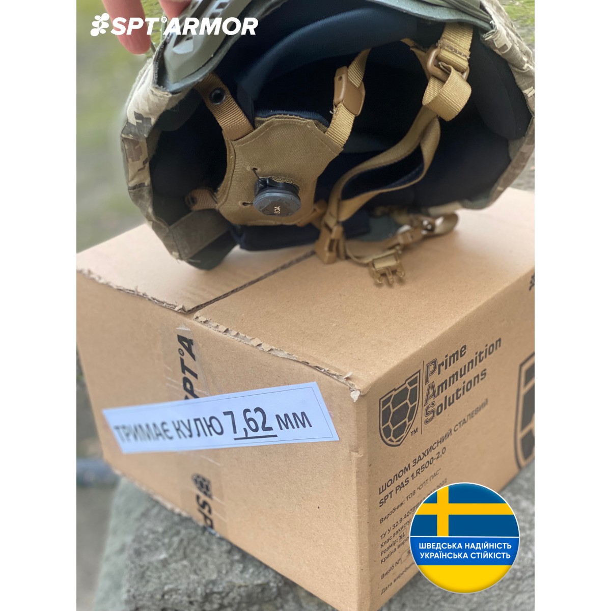 Шлем SPT-PAS 1.R500-2.0 держит пулю 7,62 мм (2-й наивысший класс по ДСТУ стальной) — современный защитный шлем военного образца, произведённый компанией SPT Armor (Украина) из уникальной шведской бронестали толщиной 2,0 мм. Модель сочетает высокую баллистическую стойкость и эргономичную конструкцию FAST для удобства в службе. Пользователи отмечают надёжность защиты и высокое качество фирменного исполнения SPT PAS.