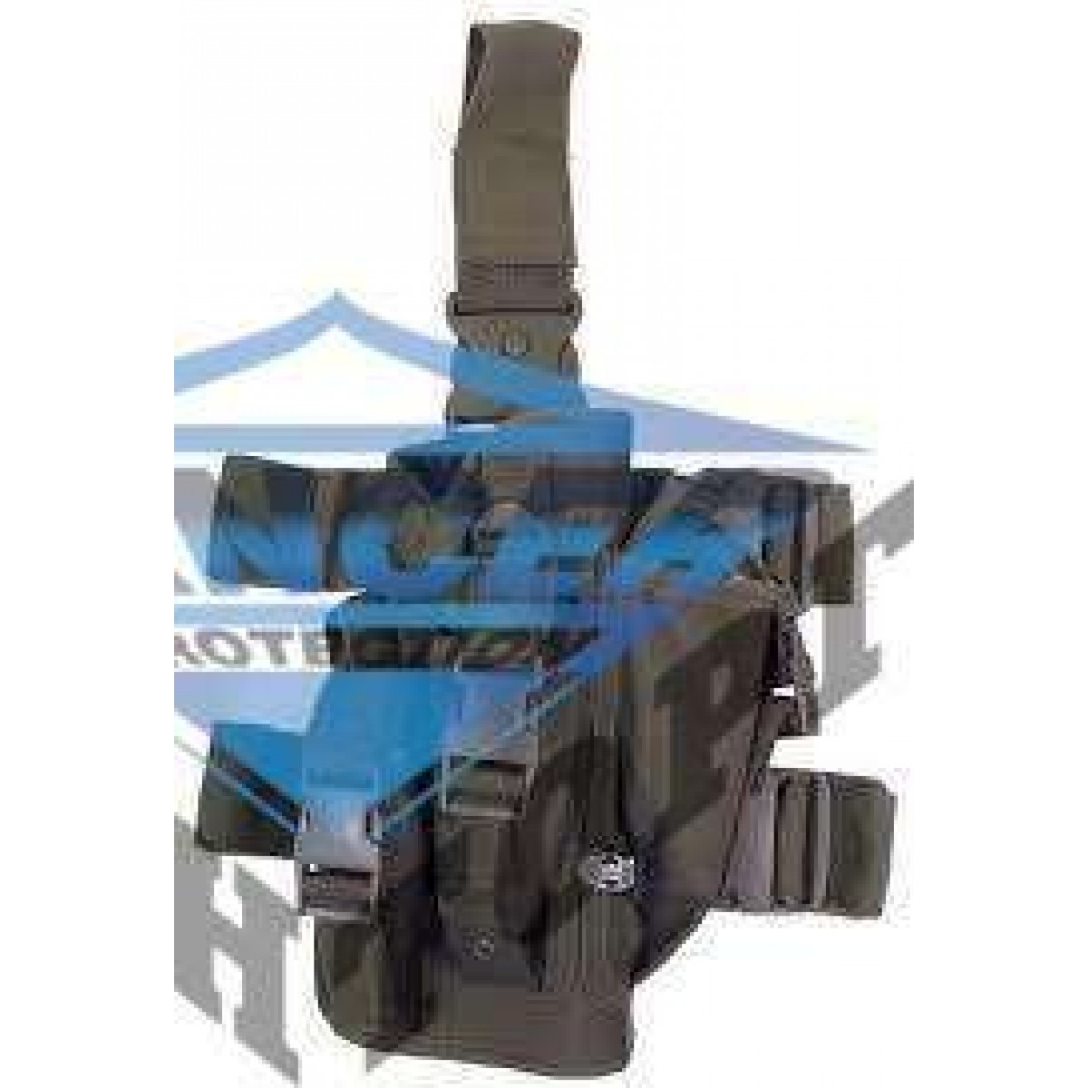 Кобура состоит из: а) набедренной платформы на которую крепится кобура; б) кармана под рацию; в) кармана под запасные магазины. Универсальная кобура крепится на систему Molle, которая обшита ПВХ для устранения скольжения. Во время ходьбы или бега пистолет не выскакивает из кобуры. Материал: 100% полиэстер; Цвет: Олива; Высота: 19 см; Вес: 555 грамм.