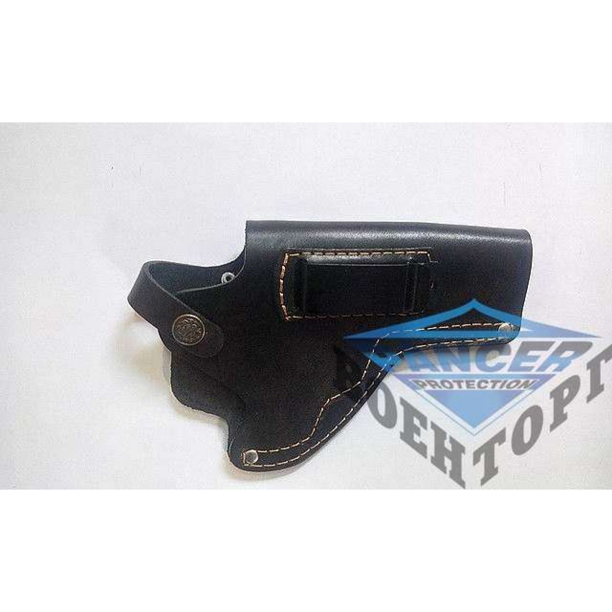 Кобура поясная для револьвера 4", кожаная со скобой. Изготовлена из натуральной кожи и предназначена для ношения на ремне шириной не более 50 мм. Крепится вертикально. Для удобства извлечения револьвера предусмотрен небольшой наклон. Для скрытого ношения присутствует металлическая скоба на внешней стороне кобуры. Фиксация при помощи скобы осуществляется под прямым углом.