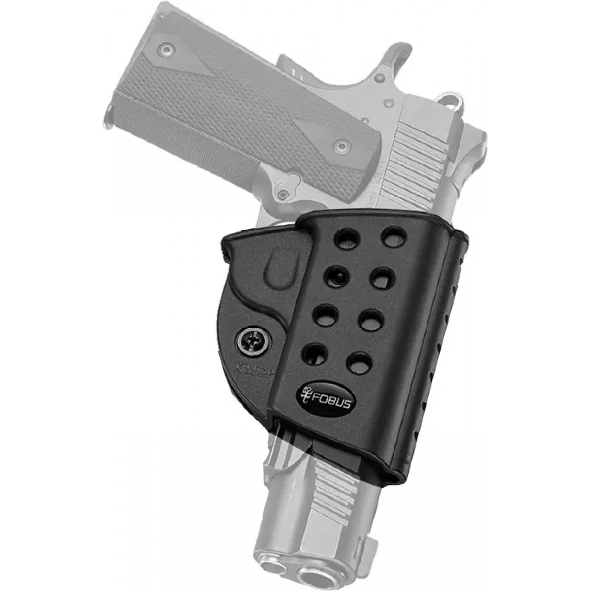 Поясная кобура Fobus KMSP изготовлена методом литья из высокопрочного полимера и предназначена для пистолетов Форт-12, Форт-14 и Colt 1911. Низкопрофильный дизайн способствует более скрытому ношению кобуры. Конструкция  позволяет быстрым и уверенным движением вверх легко извлекать из нее оружие.