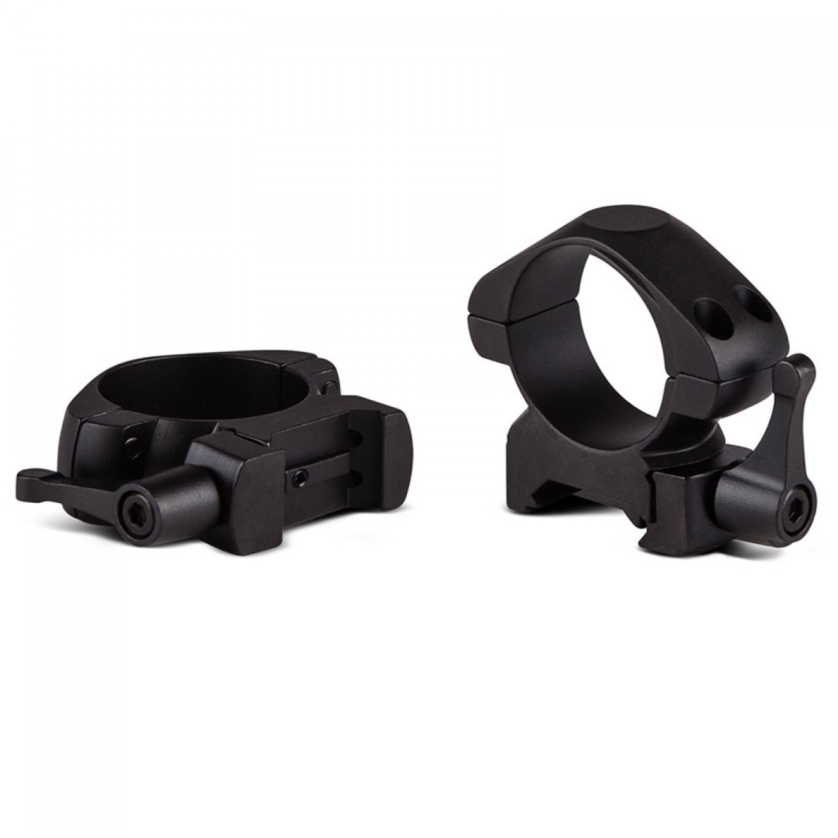 Монтажные кольца Ø 30 мм средней посадки с рычажным механизмом Quick Release. В экстремальной ситуации быстросъемная система позволит за пару движений снять прицел с оружия. Кольца устанавливаются на рельсовую планку Вивер (Пикатинни), выдерживают отдачу даже от серийной стрельбы.